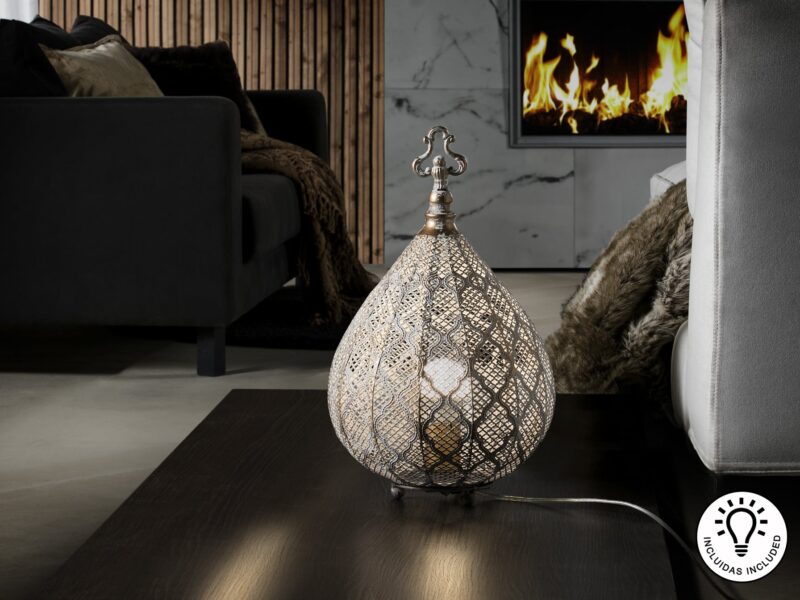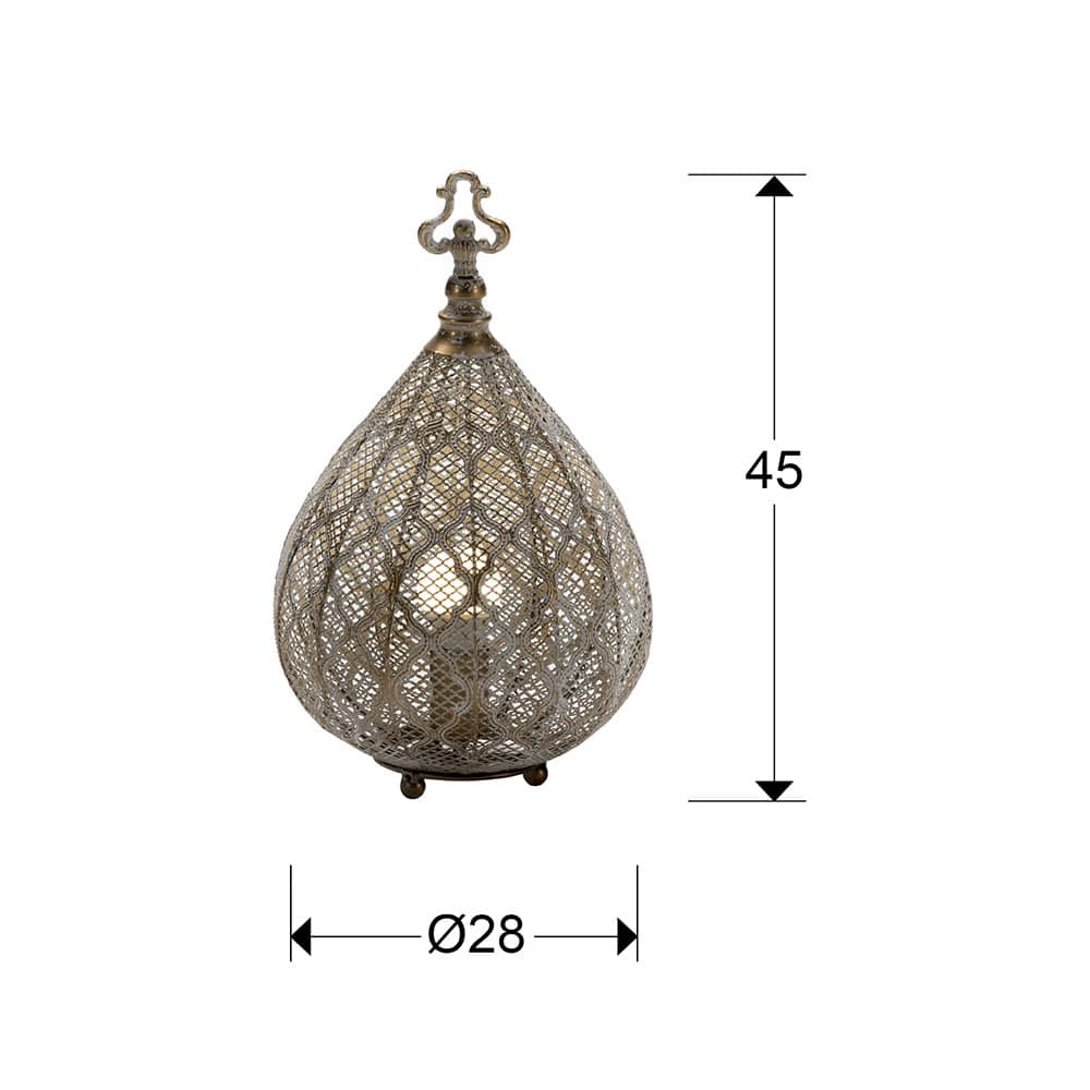Certainly its intricate design and premium materials make it a standout piece in any room. Place it on a side table, console, or mantel to add warmth and character to your space.  Additionally, the soft glow emitted by the lantern creates a cozy atmosphere.  Undoubtably, Nabila is perfect for relaxing evenings or intimate gatherings. Of course designed to impress, this table lantern is not only functional but also a decorative accent.  Subsequently, the Nabila enhances the beauty of your home.  Furthermore, its versatile champagne color finish blends seamlessly with various color palettes.  As a result, allowing you to effortlessly incorporate it into your existing decor scheme. Whether used as a centerpiece or as supplementary lighting.  The Nabila adds a touch of glamour to any setting.