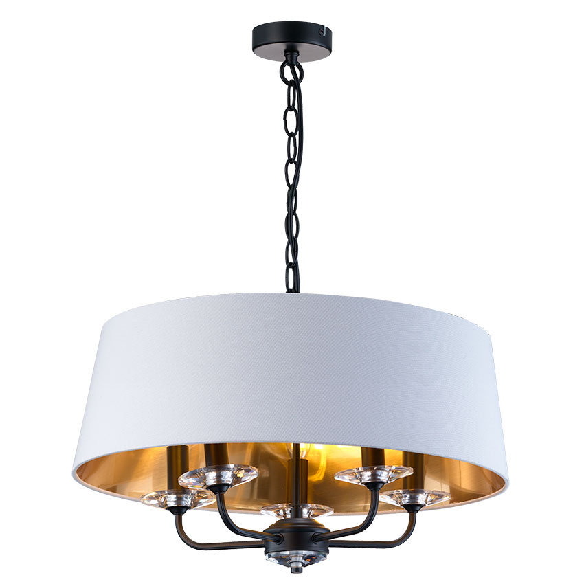 5L MATT BLACK STYLO PENDANT C/W WHITE SHADE WITH INNER GOLD FINISH H min 400 – max 1400 x D550mm Wattage 5 x E14