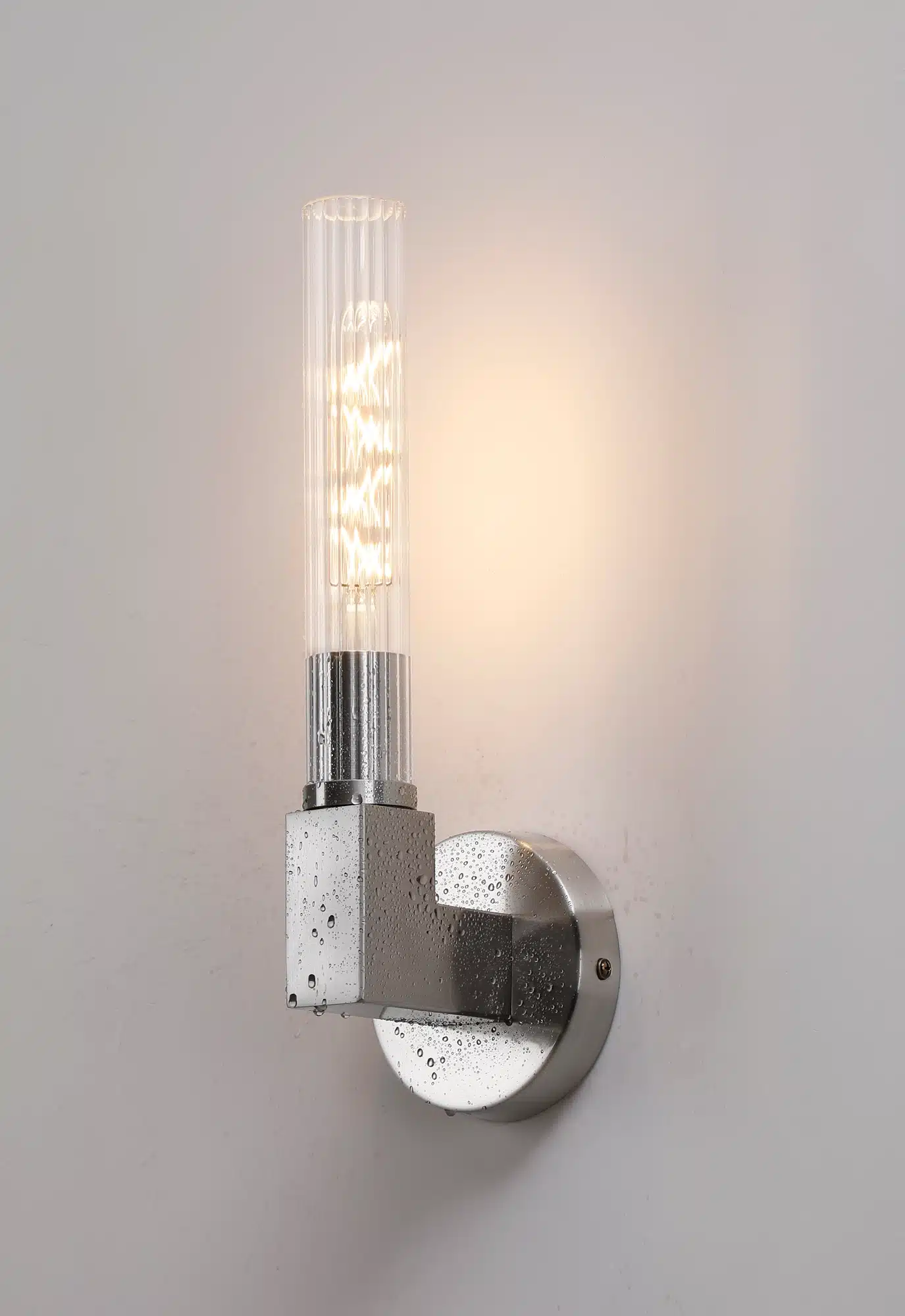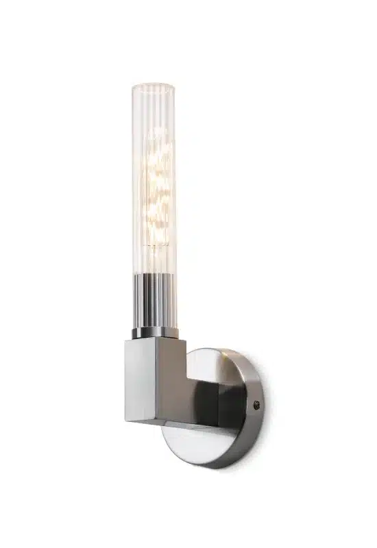 The Alia Bathroom Wall light. Its slim, grooved tubular glass design not only offers a sleek aesthetic but also delivers practical illumination for your bathroom lighting.
