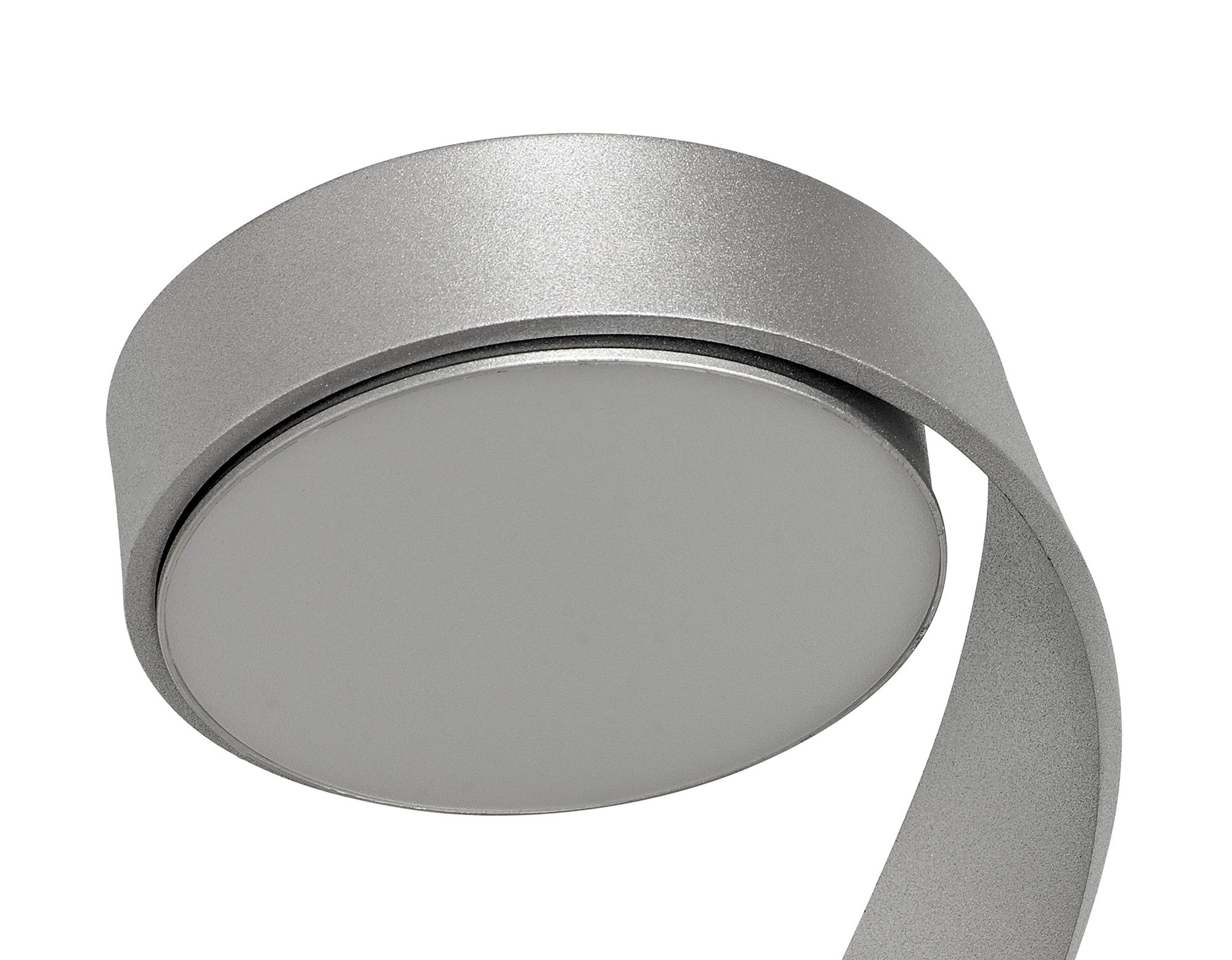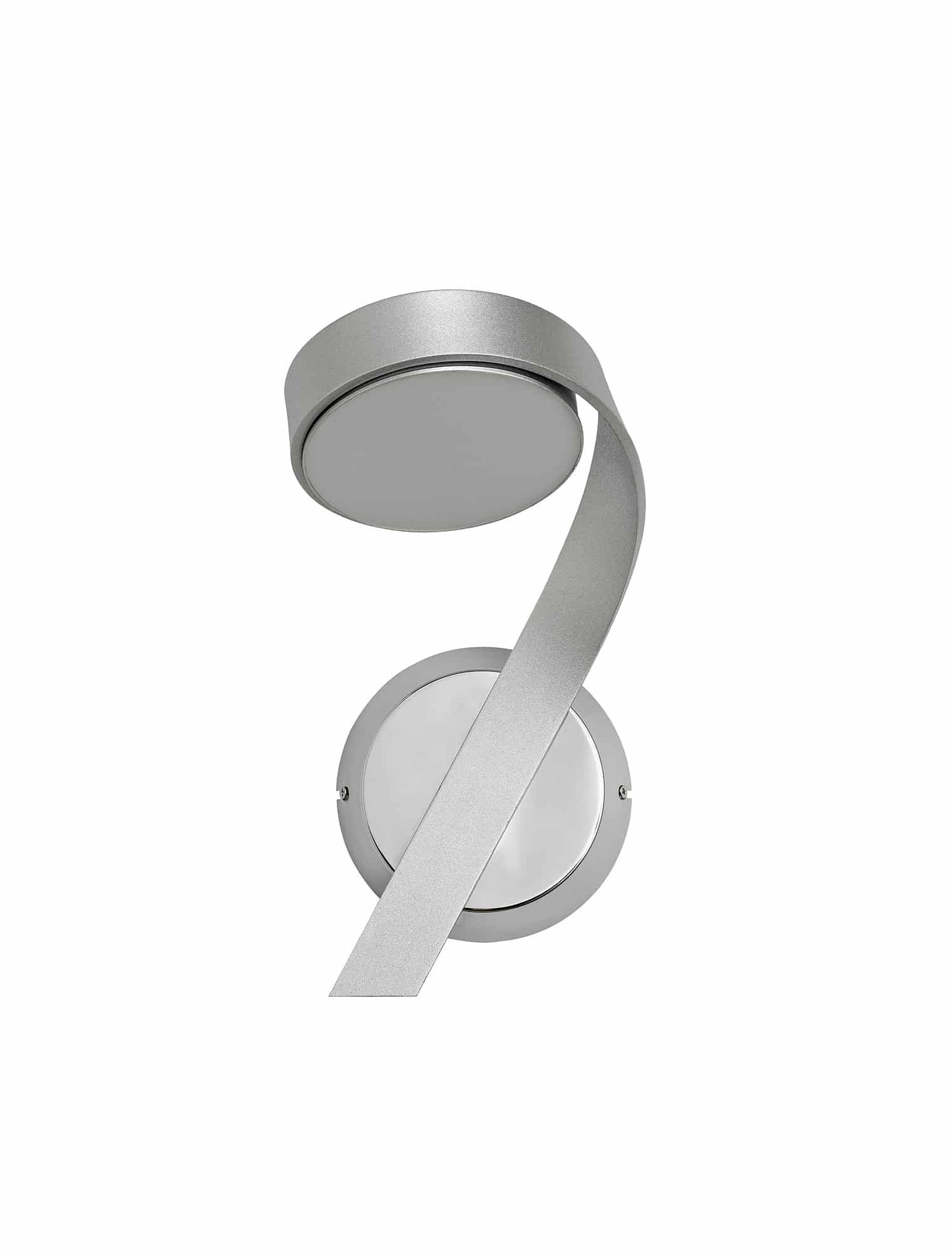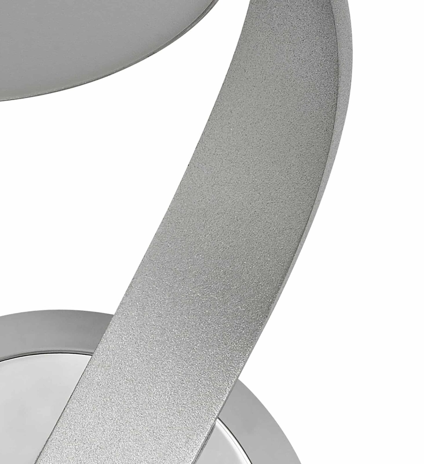 Amy presents silver framework manipulated to reflect lengths of ribbon which twist into a ring at the end. These rings encircle the round diffuser disk that houses the integral 3000K LED’s. The flat disk surface dispels the optimum amount of light possible to ensure there is no waste from the high wattage LED’s. The switched wall lights are available in both a left and right version, along with the table lamp and semi ceiling light, the fixing plates are also round in keeping with the rest of the fixture.