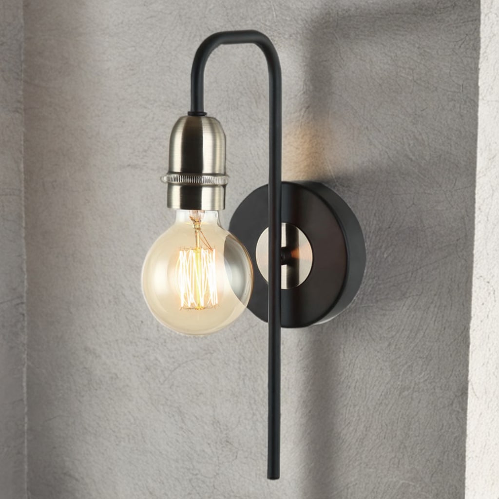 This is a vintage-style wall sconce light fixture featuring an exposed Edison bulb. The fixture has an antique brass finish with a round wall mount and a slim, elongated arm that curves to hold the bulb. The pull chain switch hangs down vertically, adding to the classic, industrial aesthetic.