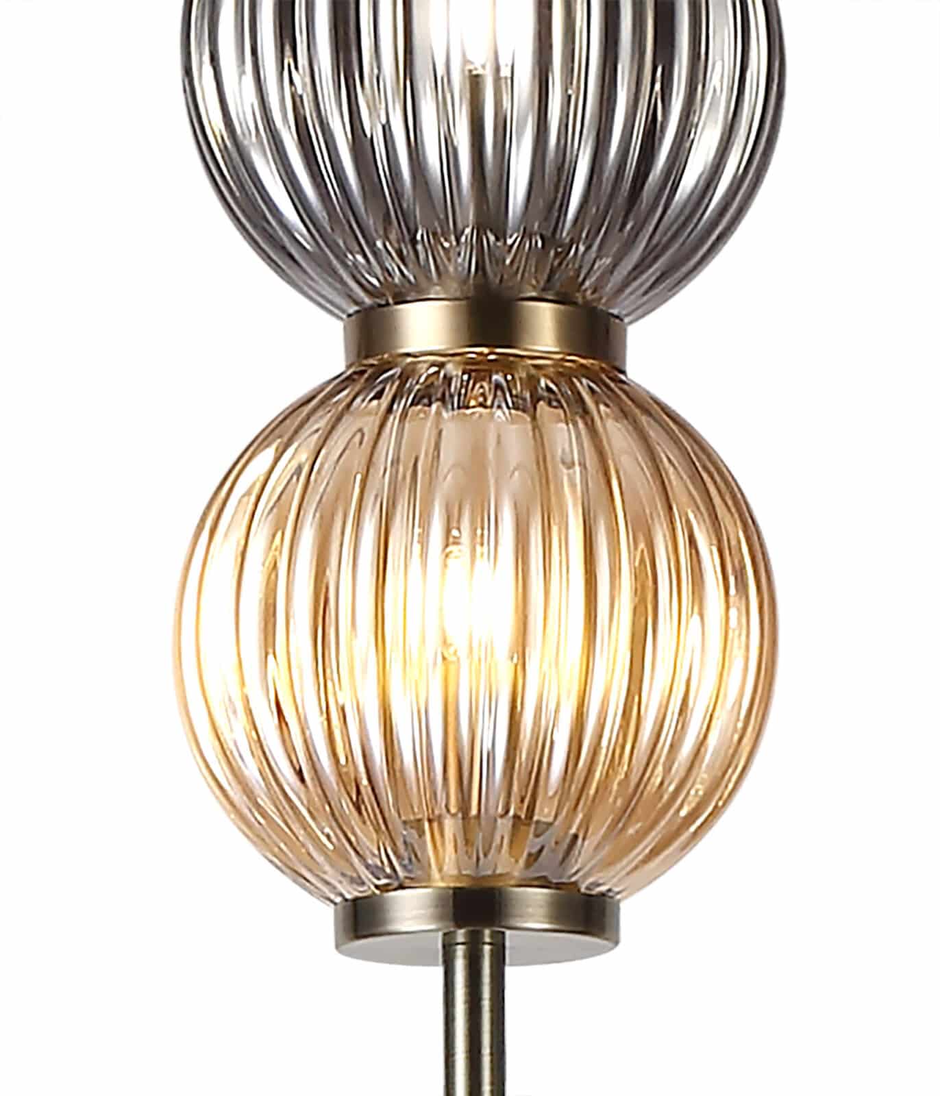 Archi Floor Lamp, 3 x G9, Antique Brass/Smoked & Amber Glass pendant, table and floor lamp featured in the Archi range host a two tone effect produced by the smoked and amber globe glass. These glass pieces, encircling the G9 lamp holders, have a ridged moulding enhancing the luminous sheen given off their coloured tint. The glass fixes to the slim tubular stem, finished in antique brass, in such a way that imitates beads being threaded along string. This peculiar composition can be partnered with one of the two wall lamps available with either a smoked or amber glass to tie in with the pendant, table and floor lamp.