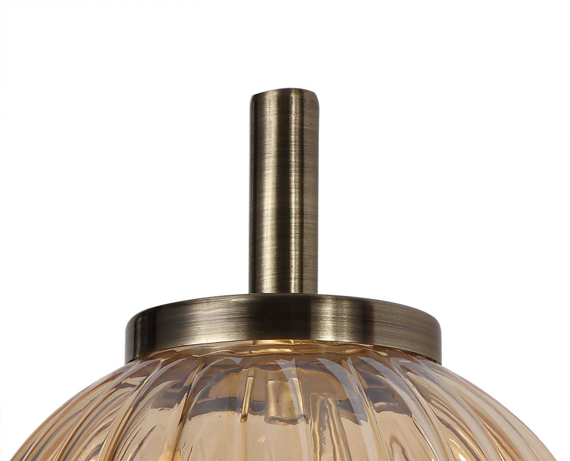 Both the pendant and table lamp featured in the Archi range host a two tone effect produced by the smoked and amber globe glass. These glass pieces, encircling the G9 lampholders, have a ridged moulding enhancing the luminous sheen given off their coloured tint. The glass fixes to the slim tubular stem, finished in antique brass, in such a way that imitates beads being threaded along string. This peculiar composition can be partnered with one of the two wall lamps available with either a smoked or amber glass to tie in with the pendant and table lamp.
