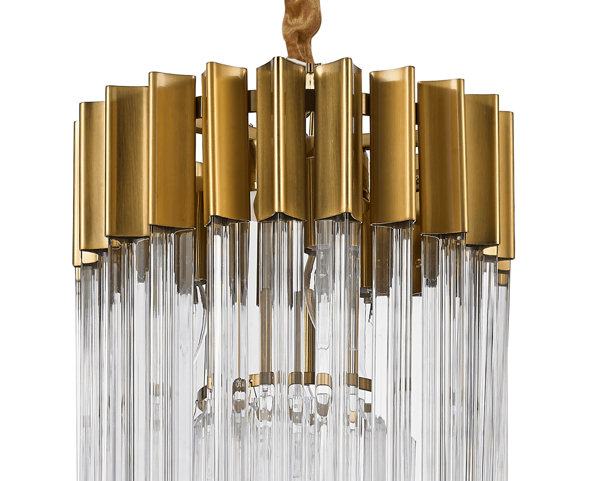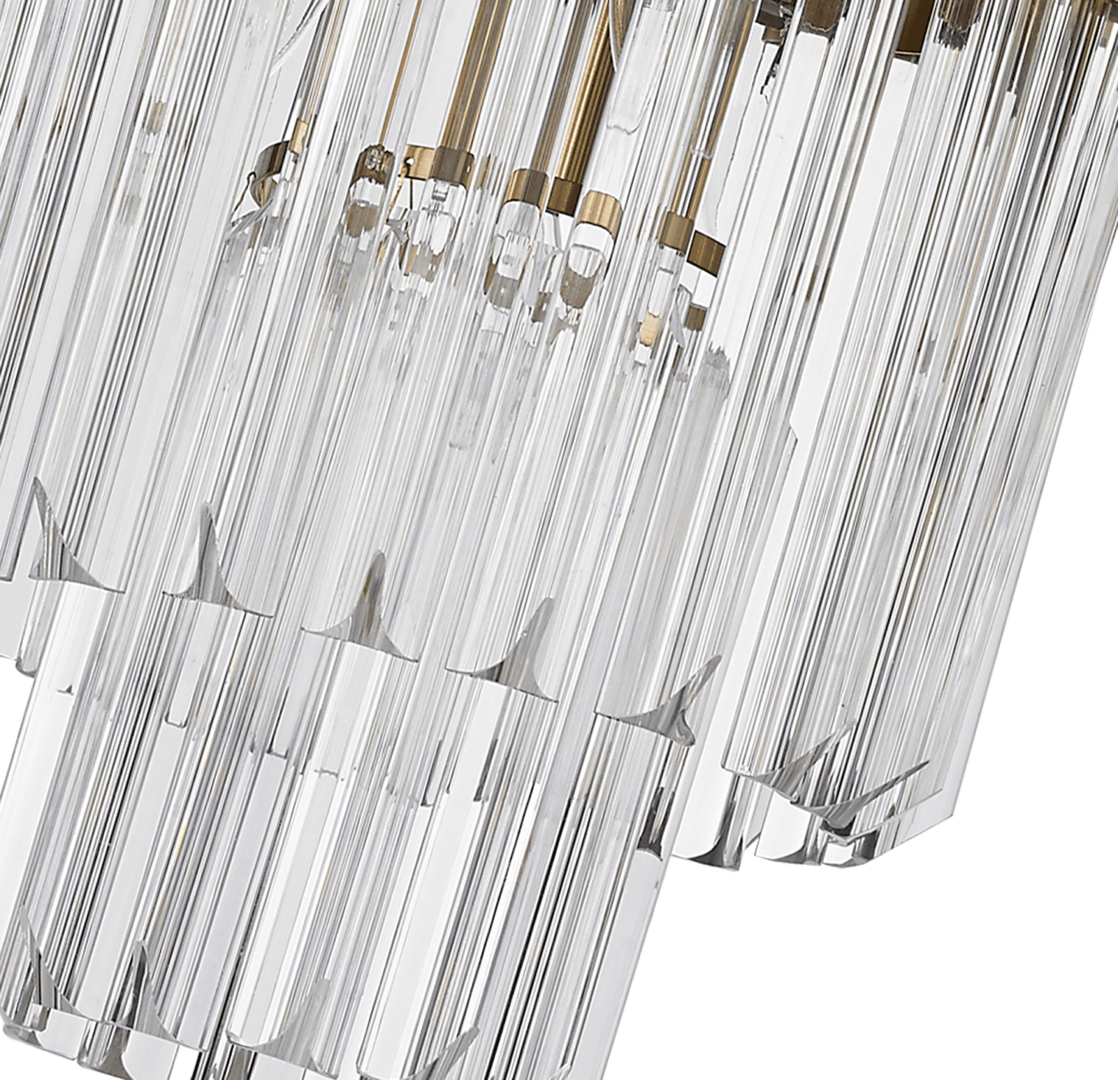 Unleash the power of sophistication with Aridius. The collection features larger, more dramatic designs, including a seven-tier chandelier and a rectangular pendant. The long angular shape of the tiered glass pieces adds a touch of grandeur to any space.