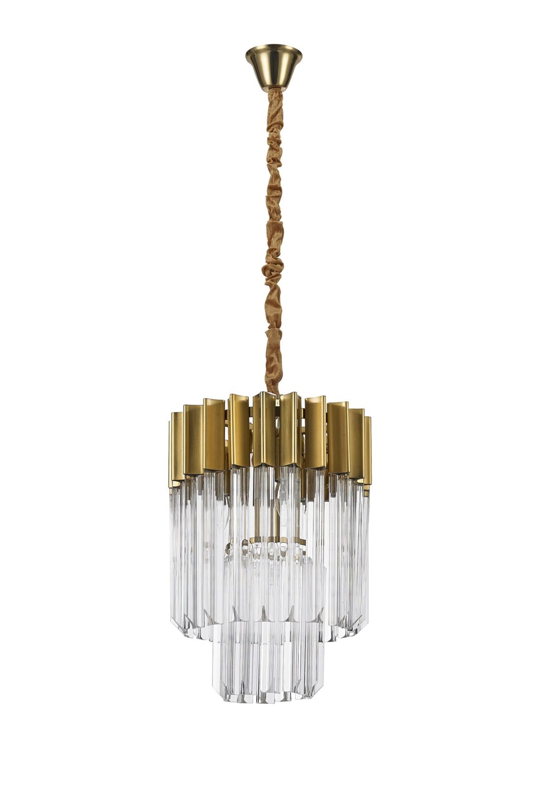 Aridius 4 Light Pendant E14, Brass/Clear Glass. The overwhelming popularity of the Aridius collection’s initial release, now expanded to meet a wider range of specification needs. This contemporary design, which combines a traditional brass finish with clear crystal glass pieces, has evolved to offer even more options. Presenting the Aridius collection with a stunning polished nickel finish and your choice of clear or smoked glass.