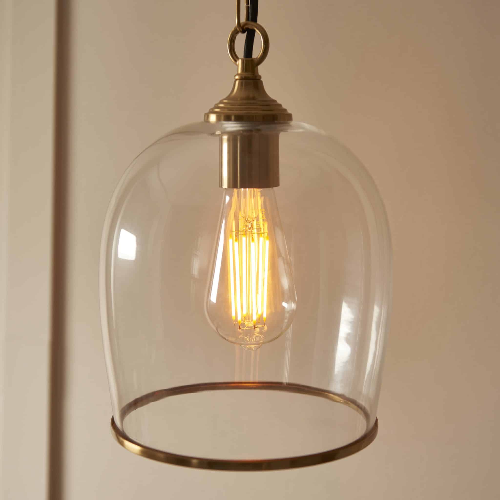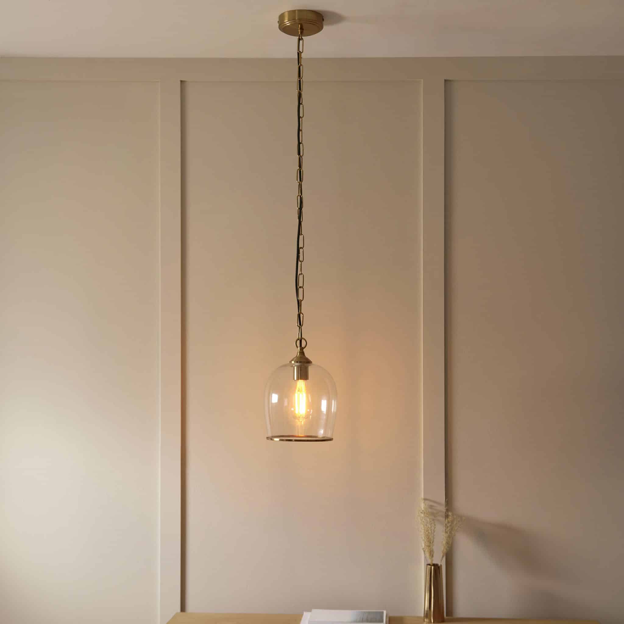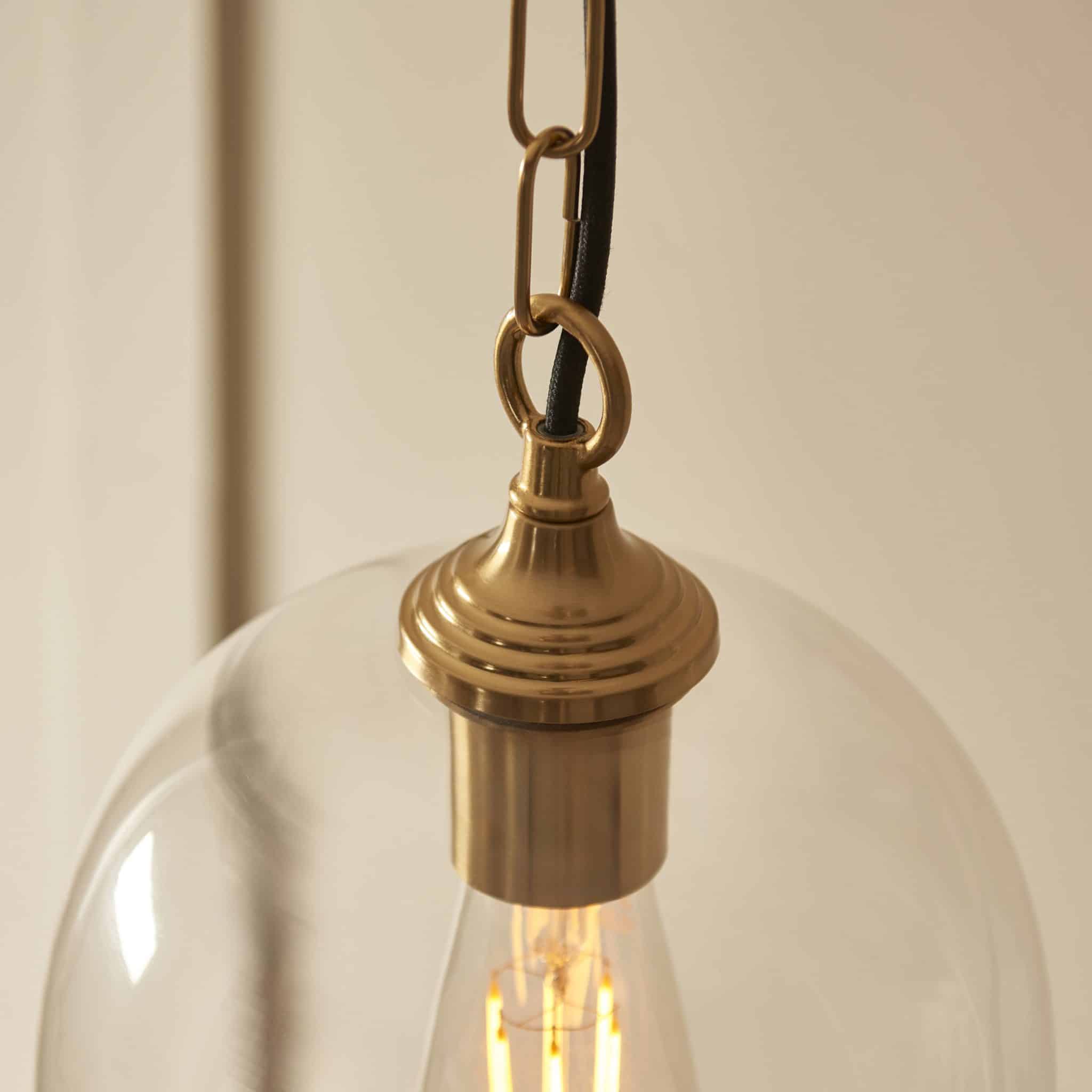 Refined and versatile, the Ashcroft pendant light in a warm brass finish, features a clear glass dome accented by a classic metal edge.  Additionally, the pendant is suspended from a height-adjustable chain and black braided flex for a vintage-inspired touch. The exposed bulb design adds charm and ambient warmth, making it ideal for kitchens, dining areas, or hallway settings. Style the Ashcroft pendant solo or in multiples for a striking statement with timeless appeal.