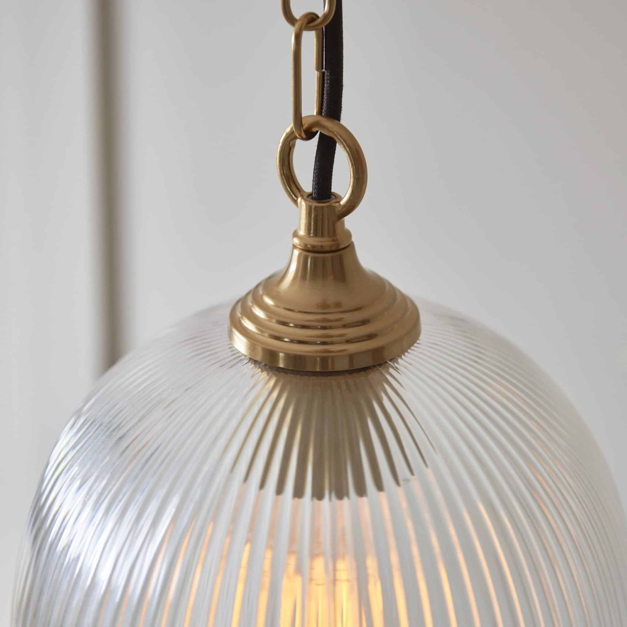 The Ashcroft pendant, smooth glass globe with brass metal trim.  Also available in a ribbed glass