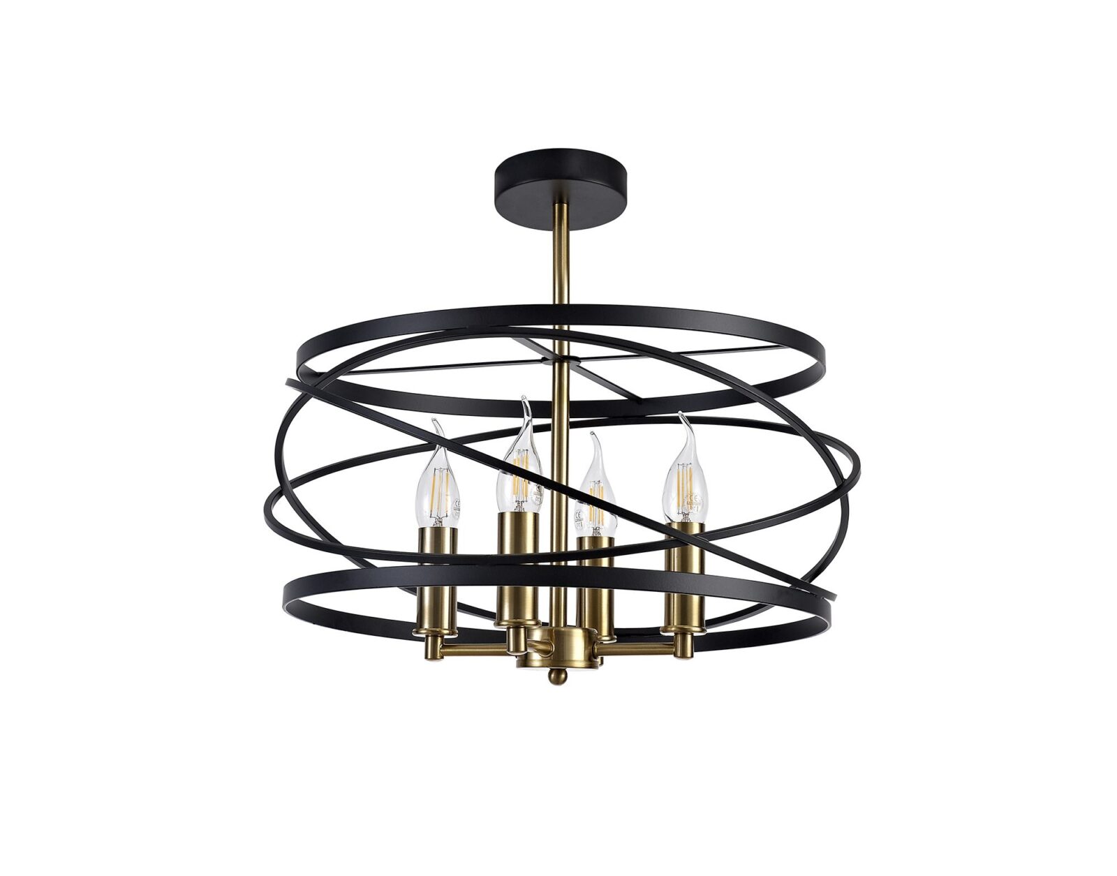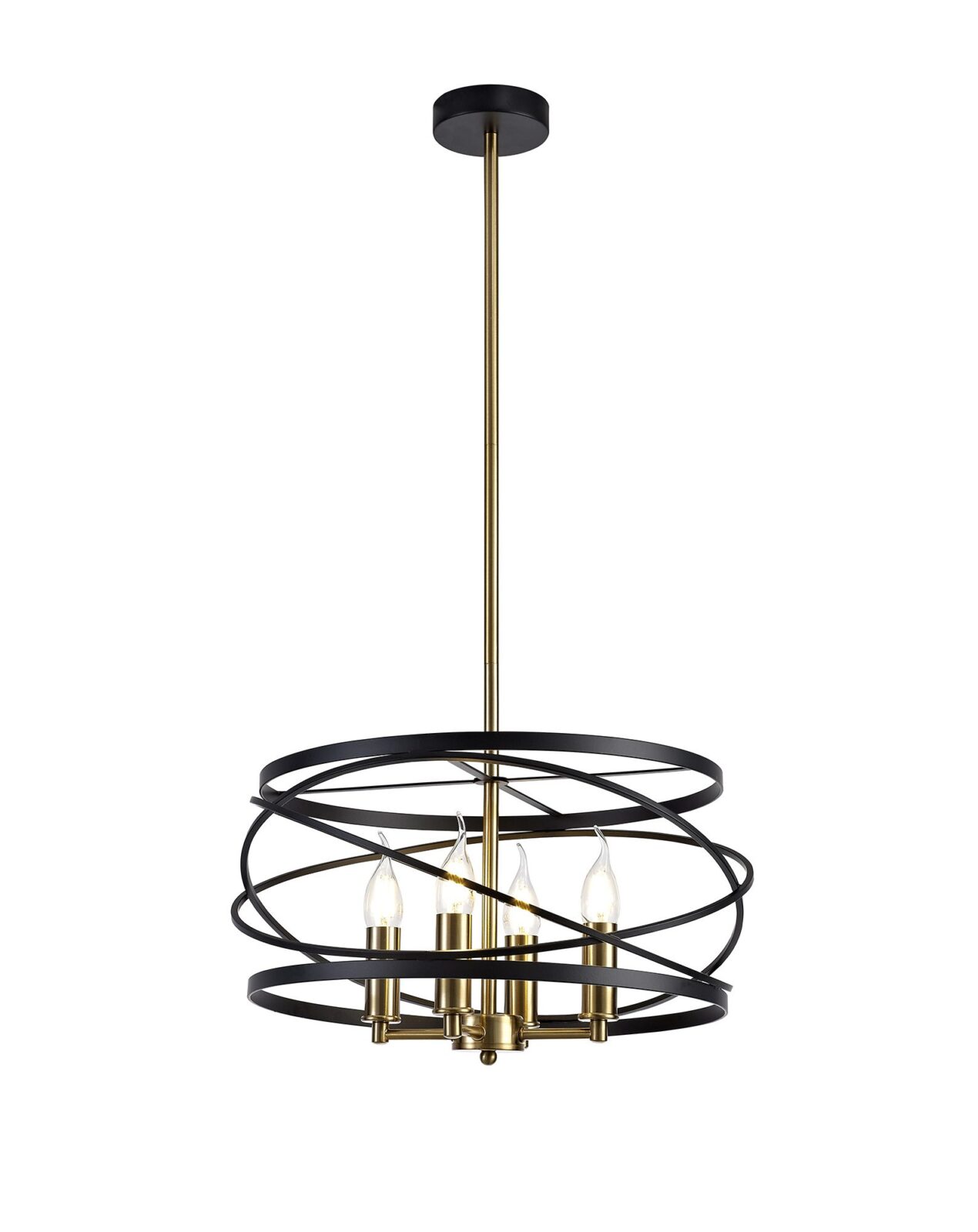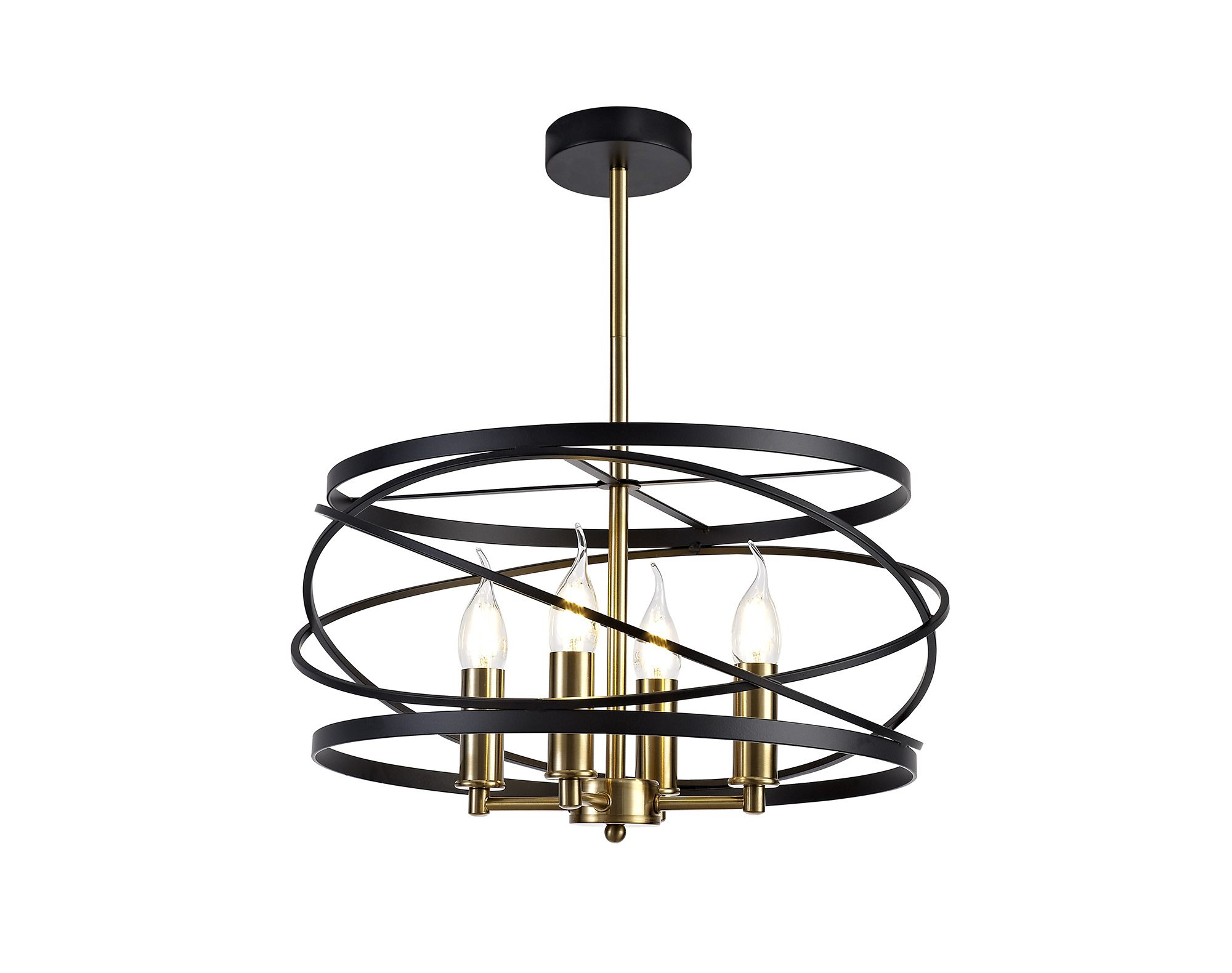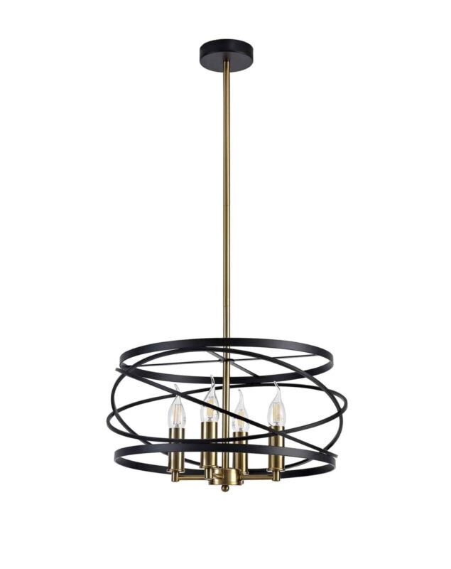Atmos intricately structured frame encircles the four E14 lampholders with over lapping angled rings. The chaotic positioning of this central feature is brought into order by the slightly wider, vertical rings positioned at the top and bottom of the frame producing a drum like shape overall. This pendant emits a classical distinguished air suitable to complement or create a stylish room décor. The black and satin gold colour is the final sophisticated touch to complete an elegant traditional pendant.