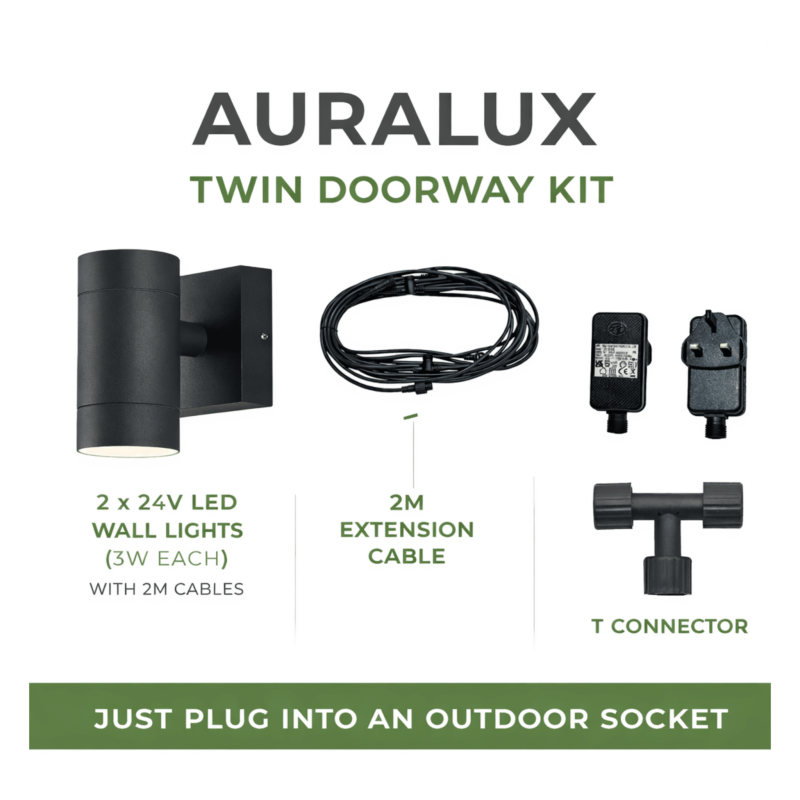 Designed for lighting either side of a doorway, this Auralux plug & play kit gives you a clean, balanced outdoor look with zero hassle.