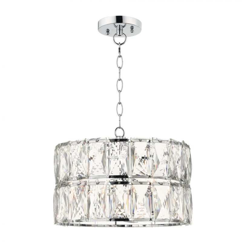 The Stunning Aurora 3 Light Crystal Pendant is comprised of chunky faceted clear coffin crystals encased in a polished chrome trim.  The luxurious crystal creates a beautiful sparkling effect when illuminated.  The Aurora is available in a 5 Light and 1 Light Pendant and is fully LED compatible.