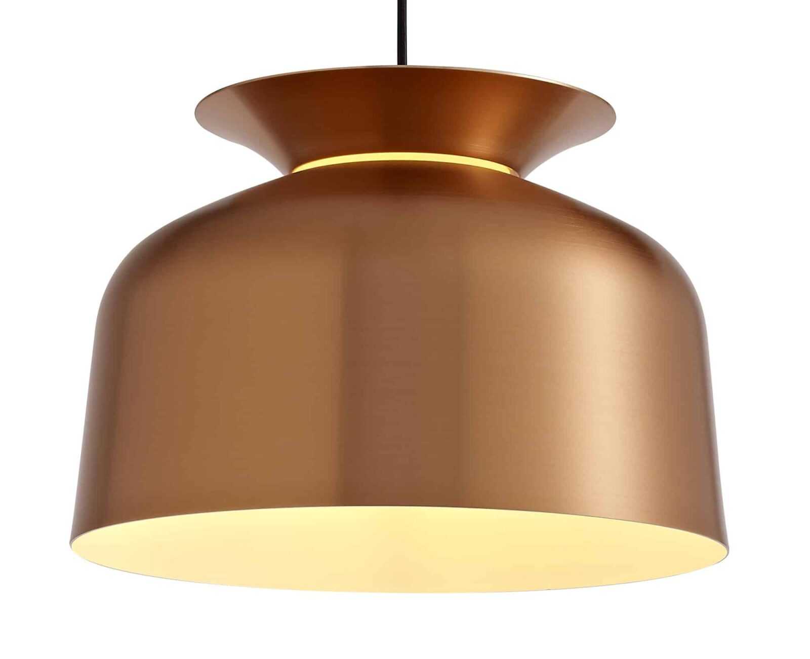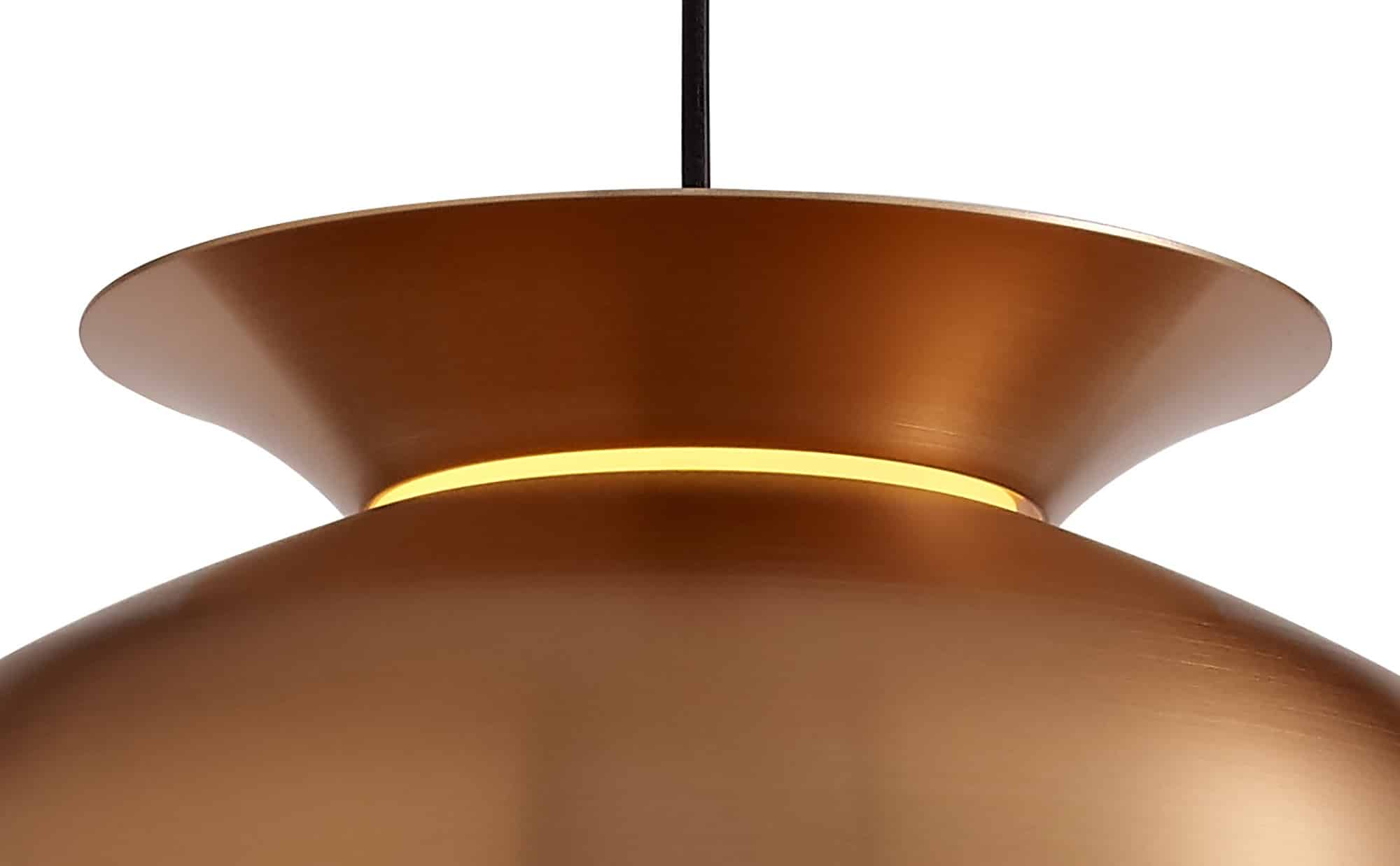 Austin is a collection of single pendants, the frames are formed from a larger dome shape and a shallow dish both positioned in different directions to outline the shape of a serving bowl. The slim diffuser where each piece meets has been added to give a soft halo of light in-between both shapes projected from the E27 lampholder which dispels the main source of light from the larger open shade.