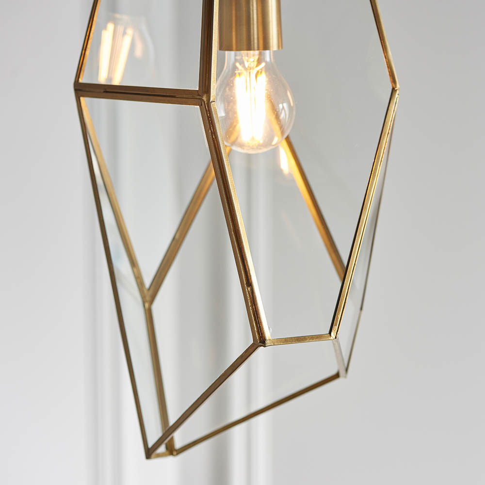An angular cage pendant made from glass panels with an antique brass effect trim. Compatible with LED lamps and dimmable. An angular cage single pendant Antique brass plated Clear glass panels Height adjustable antique brass chain with black fabric flex Dimmable Perfect for use with E27 LED lamp