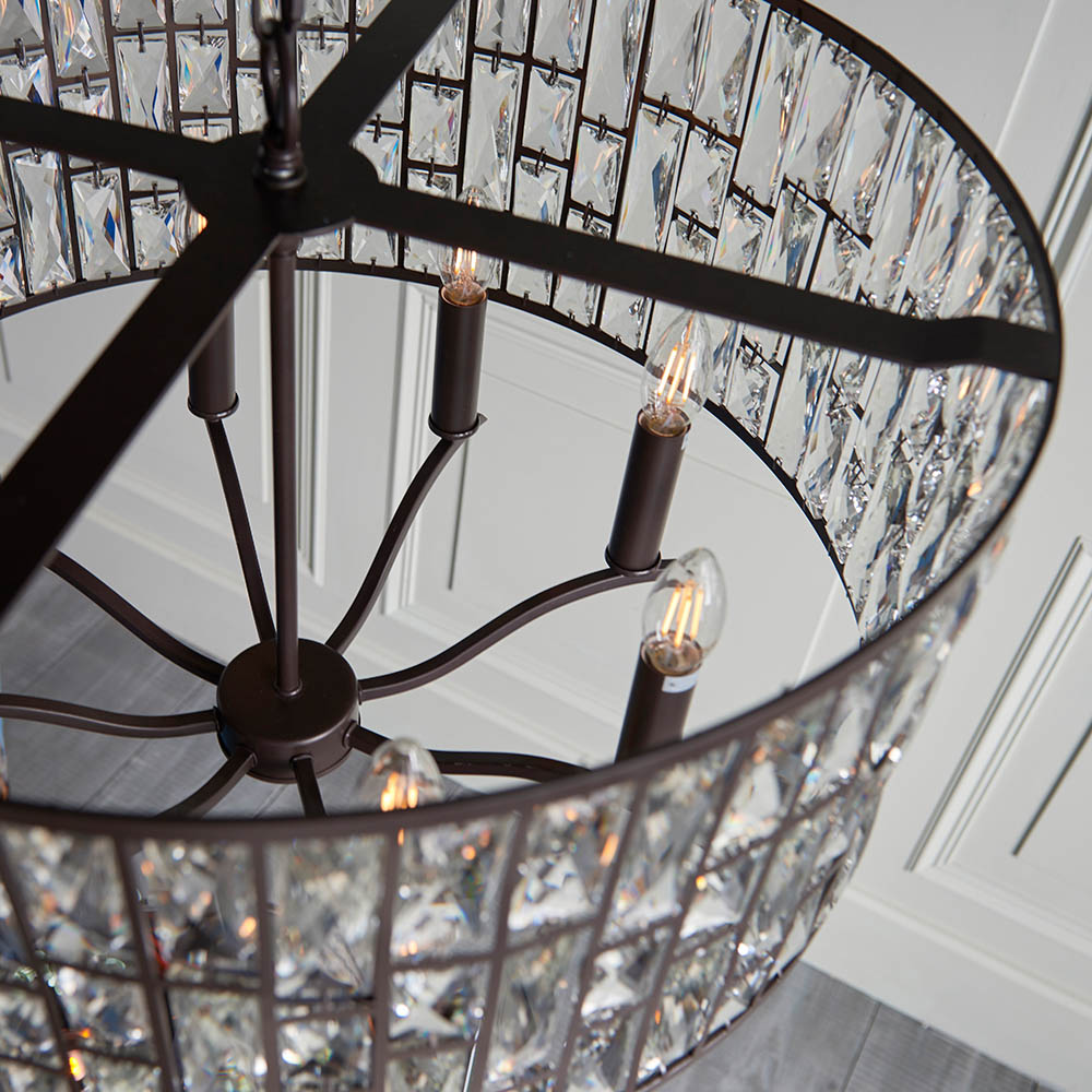 The Belle 8 light pendant mixes high quality faceted clear crystals, arranged in a striking tiered pattern, with an understated dark bronze effect finish. Once lit each crystal combines to create an intensified decorative light effect. Perfect for timeless classic interiors. Classic decorative style High quality K5 faceted glass crystals Dark bronze finish Height adjustable Perfect for use with E14 LED lamps