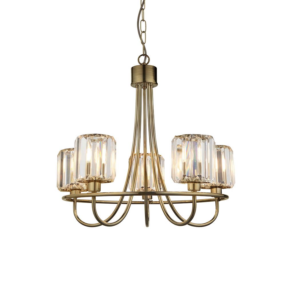 Sophisticated 5 light pendant with decorative clear cut faceted glass shades that beautifully disperse the light. Elegant arms in an antique brass plate finish; perfect for hanging in any living space. Other matching items available. A unique classic styled chandelier Antique brass plated metalwork Decorative clear cut faceted glass shades Height adjustable 1.5 metre chain with grey fabric cable Dimmable Compatible with E14 LED lamps