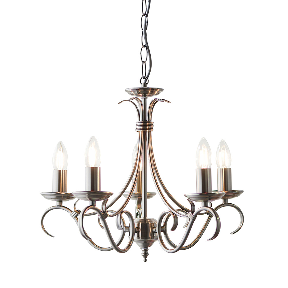 A 5 light ceiling fitting with scrolled arms in antique silver effect finish. suitable for use with LED lamps, height adjustable and dimmable. Matching items available and also comes in an antique brass finish Timeless antique silver pendant Decorative scrolled arms Adjustable height 32cm grey cable Dimmable Perfect for use with E14 LED lamps