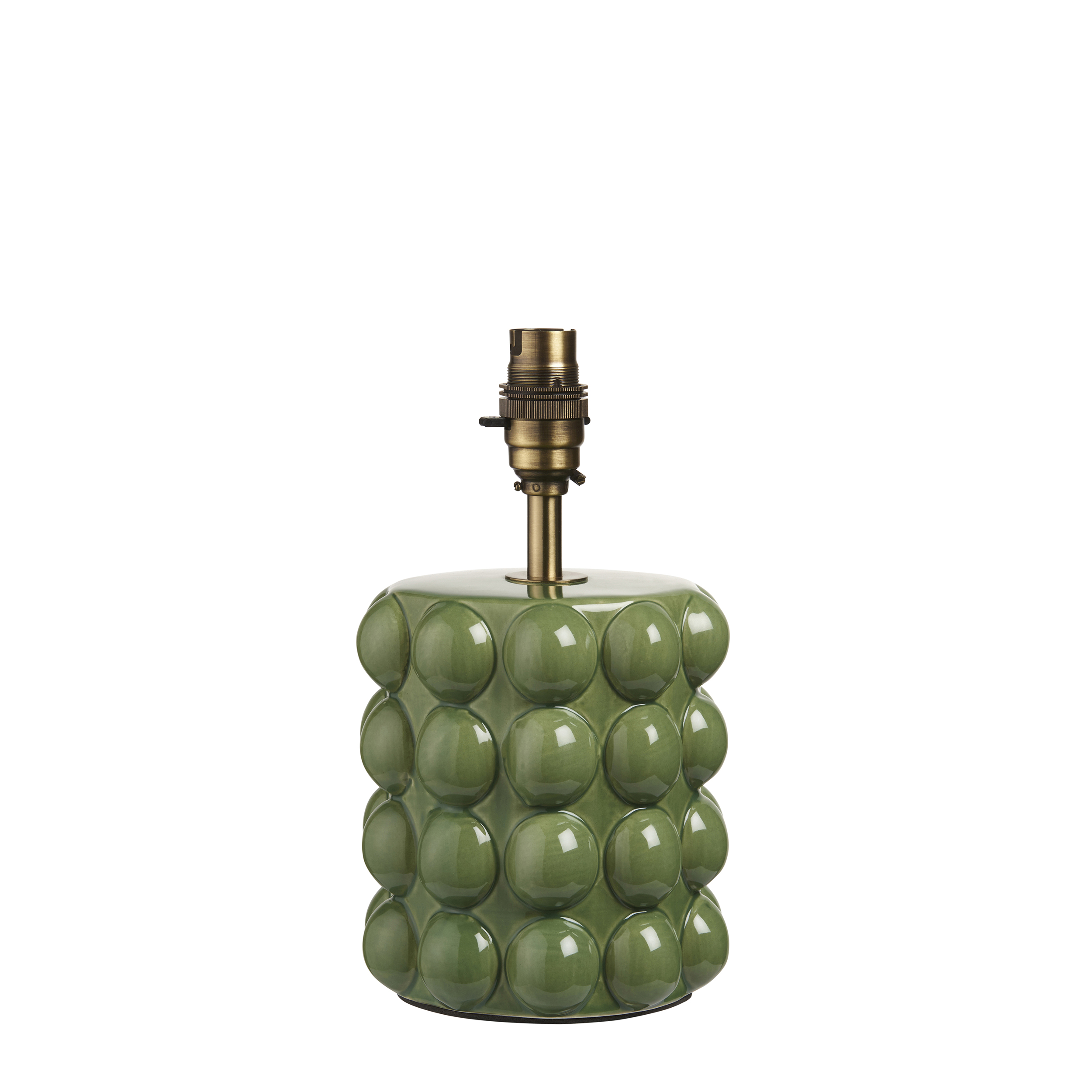 This playful ceramic base features sculptured bobble shapes finished in a gloss olive green glaze. With switched brass B22 lamp holder and grey braided flex, pair with a choice of our 25cm decorative fabric shades for the perfect interior addition. Olive green bobble ceramic table light base Aged brass plated stem Switched metal B22 lamp holder 1.5 metre silver grey colour braided flex Pair with one of our 25cm decorative fabric or raffia shades to complete the look Compatible with B22 LED lamps