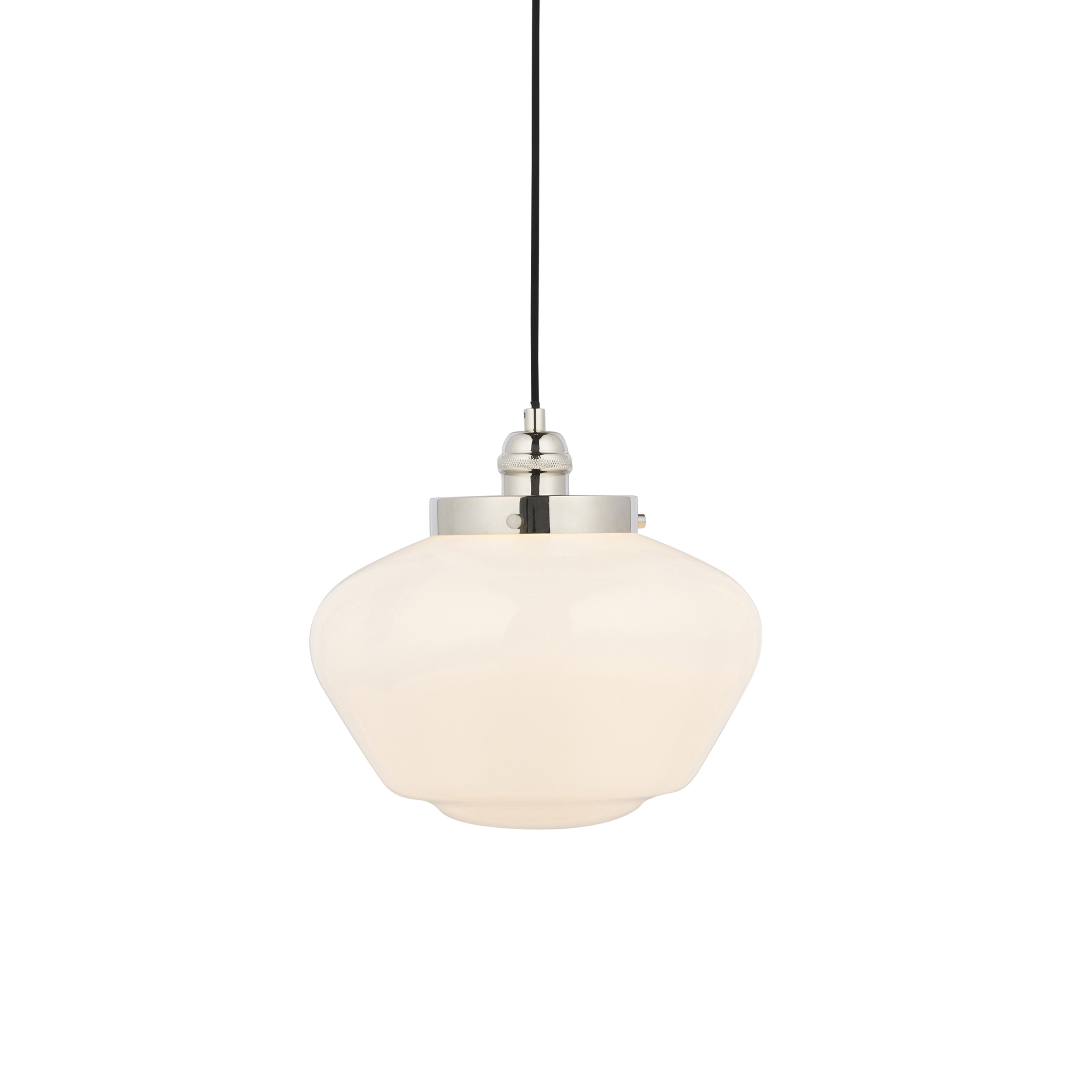 A timeless “school house” styled pendant in bright nickel with opal glass, ideal for the kitchen, above a breakfast bar or dining table. Hang individually or in a set of three. Matching semi flush also available. |Polished nickel plated metalwork Opal glass shade Adjustable height with 1.2 metre black fabric flex Dimmable Perfect for use with E27 LED filament lamps