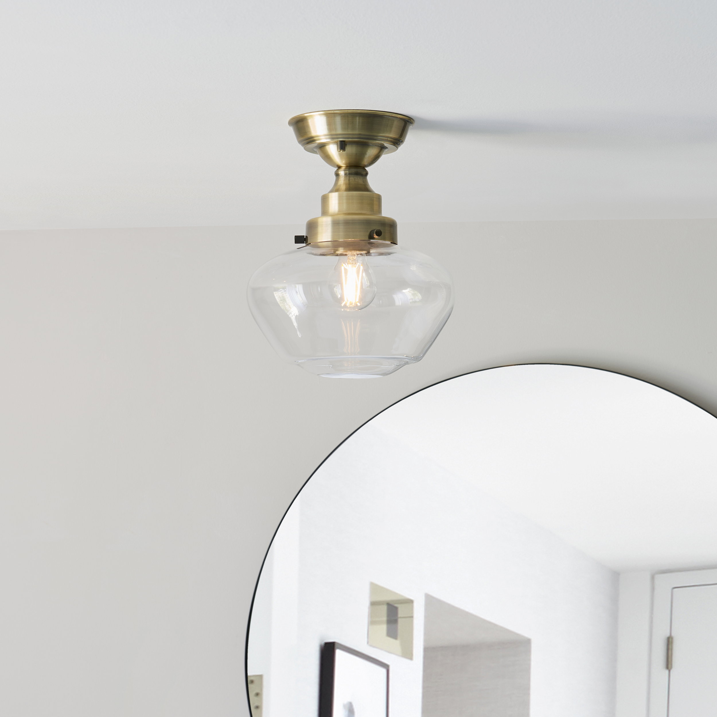 A timeless “school house” styled Camberley semi flush in antique brass with clear glass, ideal for the kitchen, above a breakfast bar or dining table. Hang individually or in a set of three. Matching pendant also available.