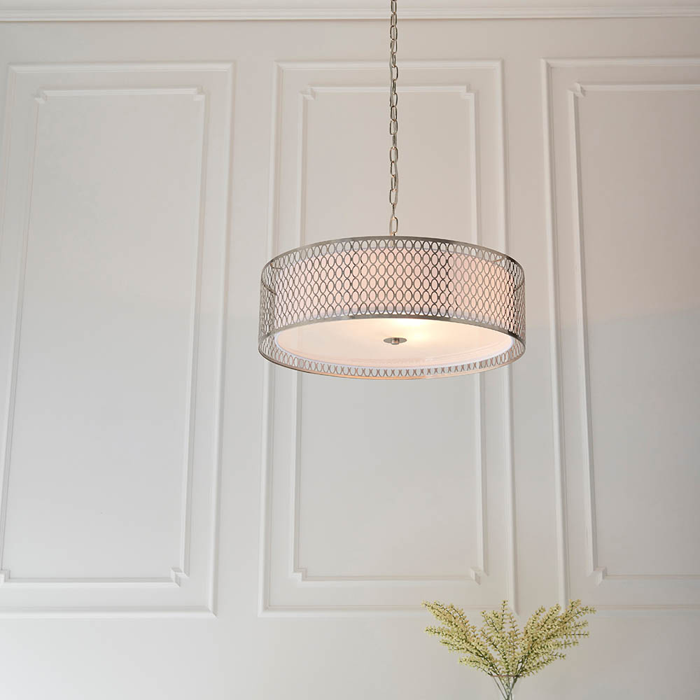 | Colour Finish | Satin nickel plate, white fabric & frosted glass |