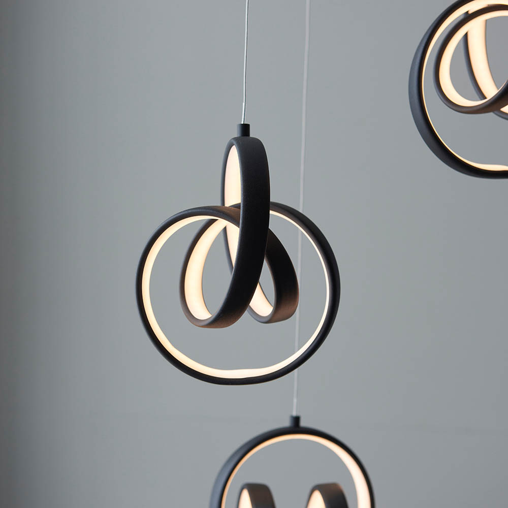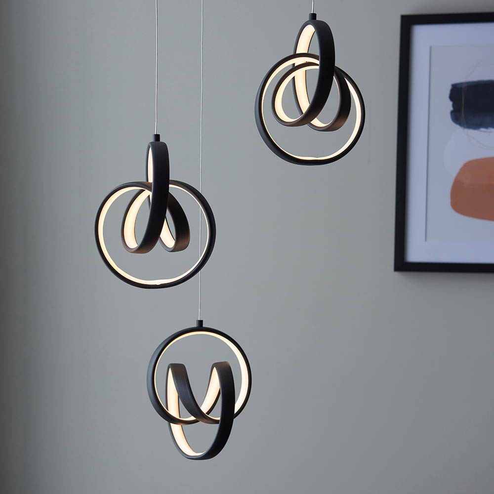 LED 3 light pendant with textured matt black finish. Intriguing swirling loops effortlessly suspend from clear flex lengths that can be adjusted in height to create a contemporary statement pendant. Dimmable when twinned with a trailing edge dimmer switch. Textured black painted metalwork Height adjustable 80cm – 120cm clear flex lengths 3 x 14W integrated LED – 1380 lumens 3,000k warm white Dimmable when twinned with a trailing edge dimmer switch