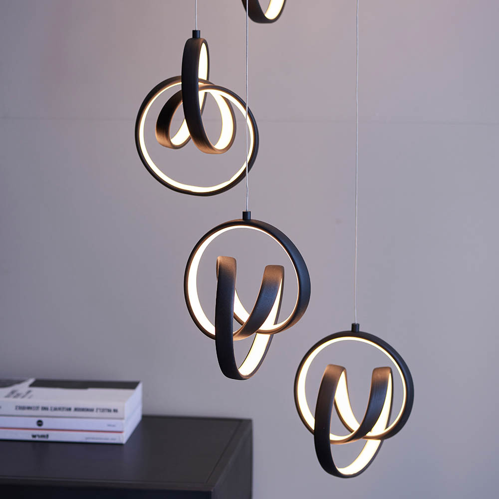 LED 8 light pendant with textured matt black finish. Intriguing swirling loops effortlessly suspend from clear flex lengths that can be adjusted in height to create a contemporary statement pendant. Dimmable when twinned with a trailing edge dimmer switch. Textured black painted metalwork Height adjustable 35cm – 175cm clear flex lengths 8 x 13.6W integrated LED – 3500 lumens 3,000k warm white Dimmable when twinned with a trailing edge dimmer switch