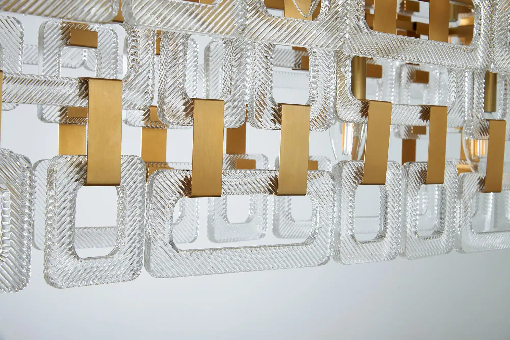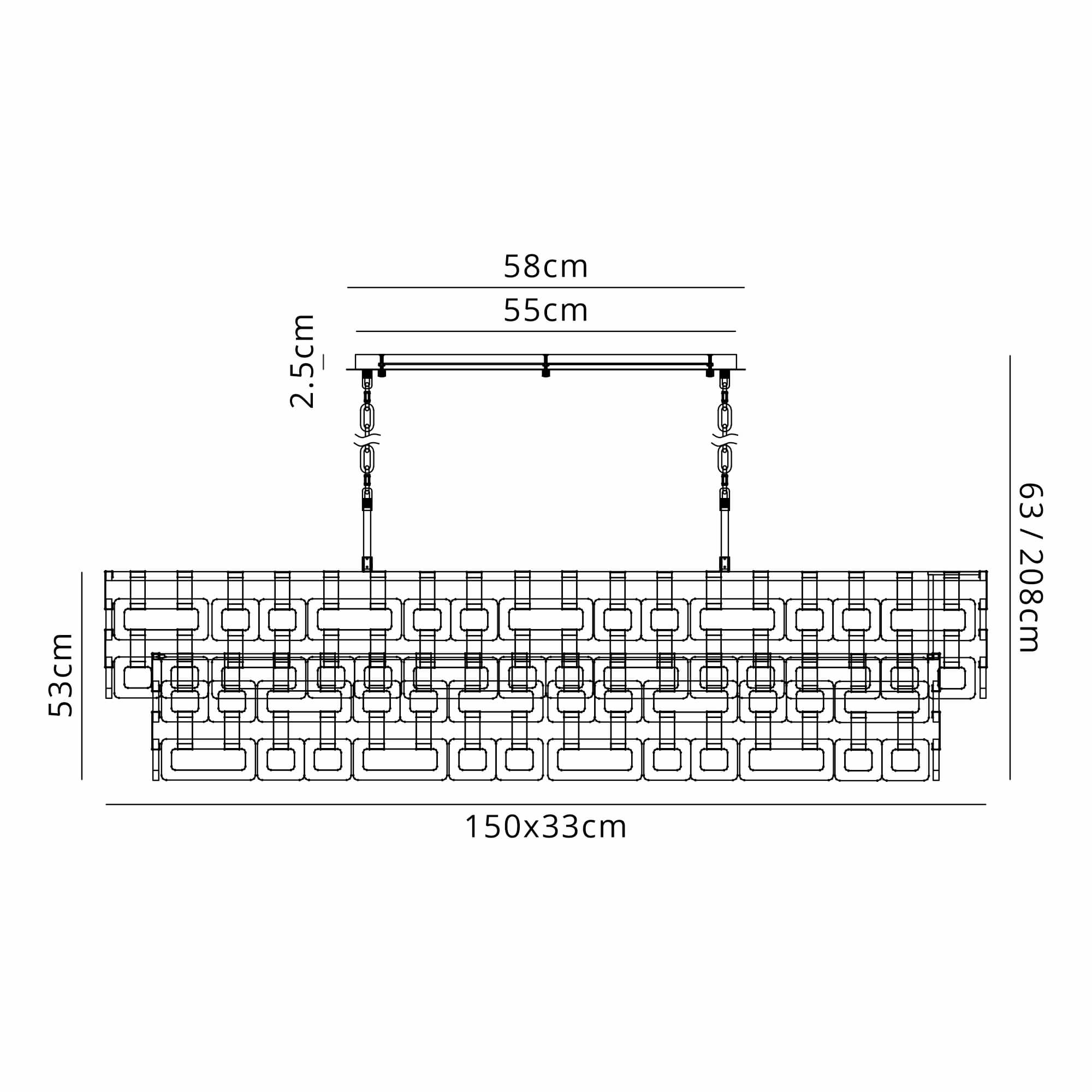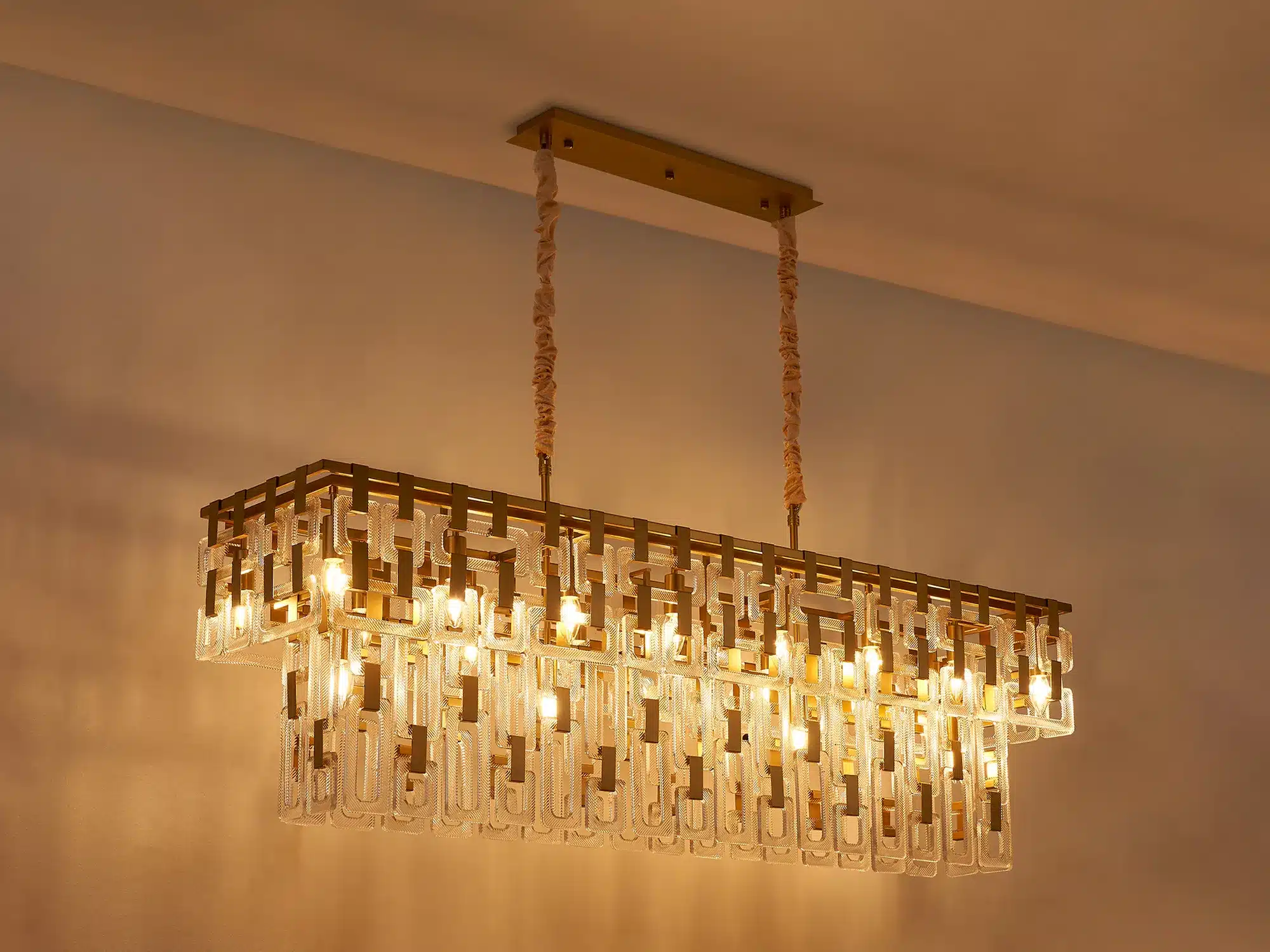 The Dalkey 20 light linear pendant is a striking statement light, crafted from an intricate arrangement of square and rectangular clear glass pieces that create a beautiful chain-mail inspired effect. The layered glass design captures and reflects light from every angle, producing a dazzling display of sparkle and shadow above dining tables or kitchen islands.
