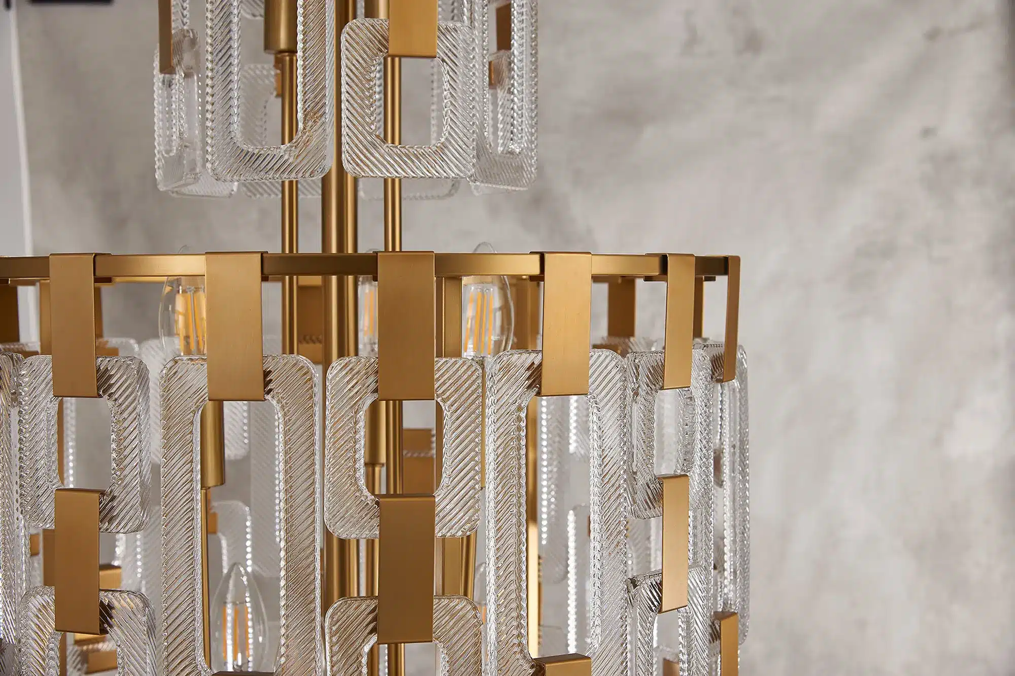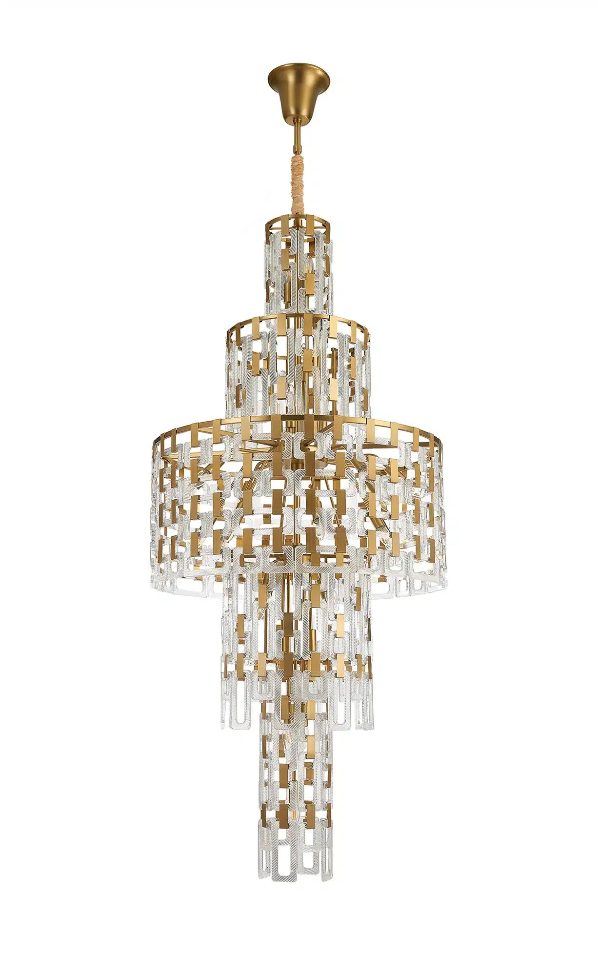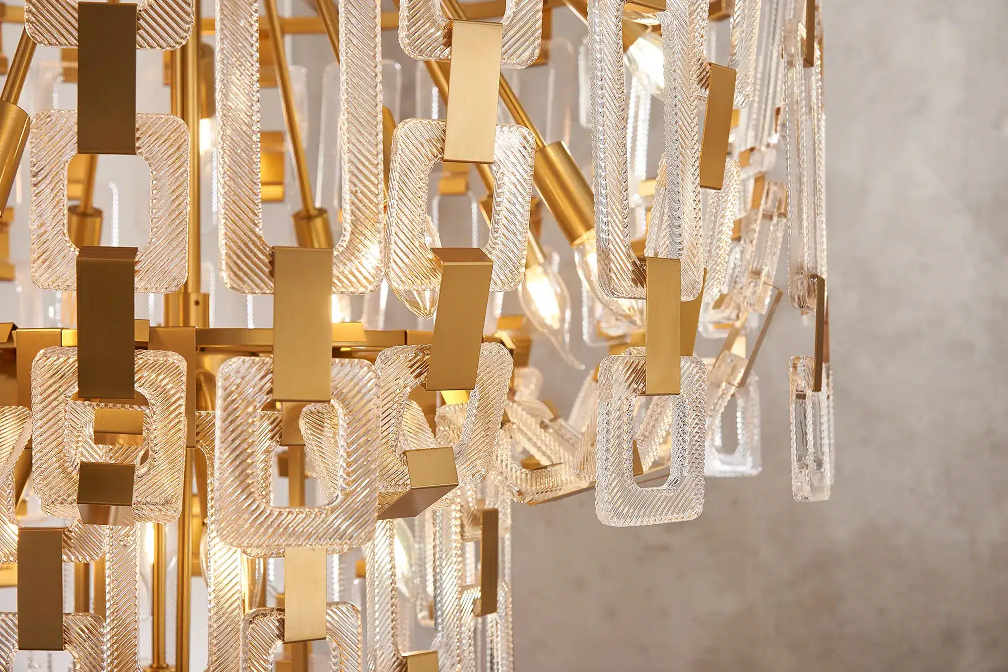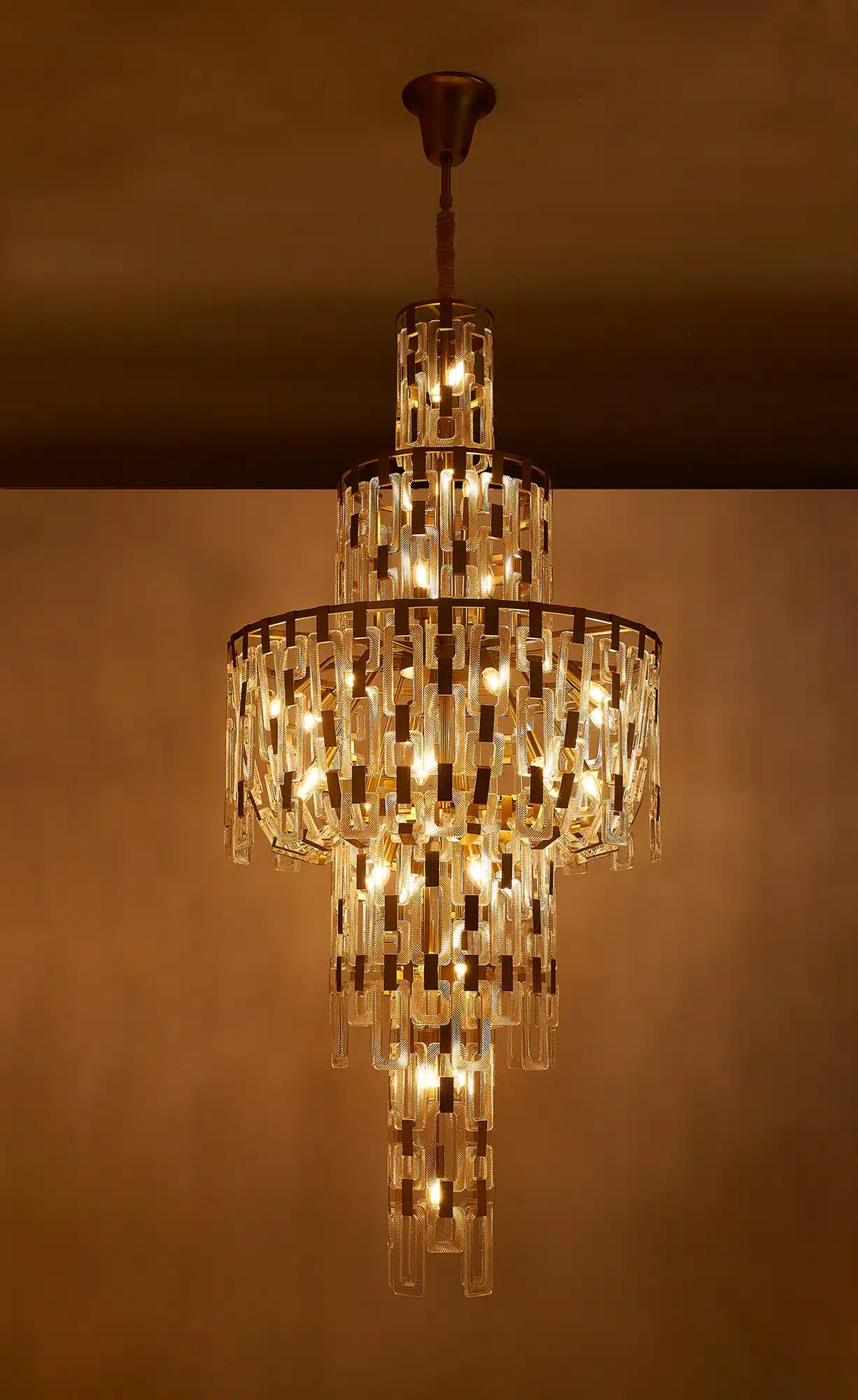 The Dalkey 33 light chandelier is a dramatic centrepiece that blends sculptural design with dazzling illumination. Layers of square and rectangular clear glass pieces form an elegant chain-mail inspired structure, beautifully capturing and reflecting light to create a stunning play of sparkle and shadow.