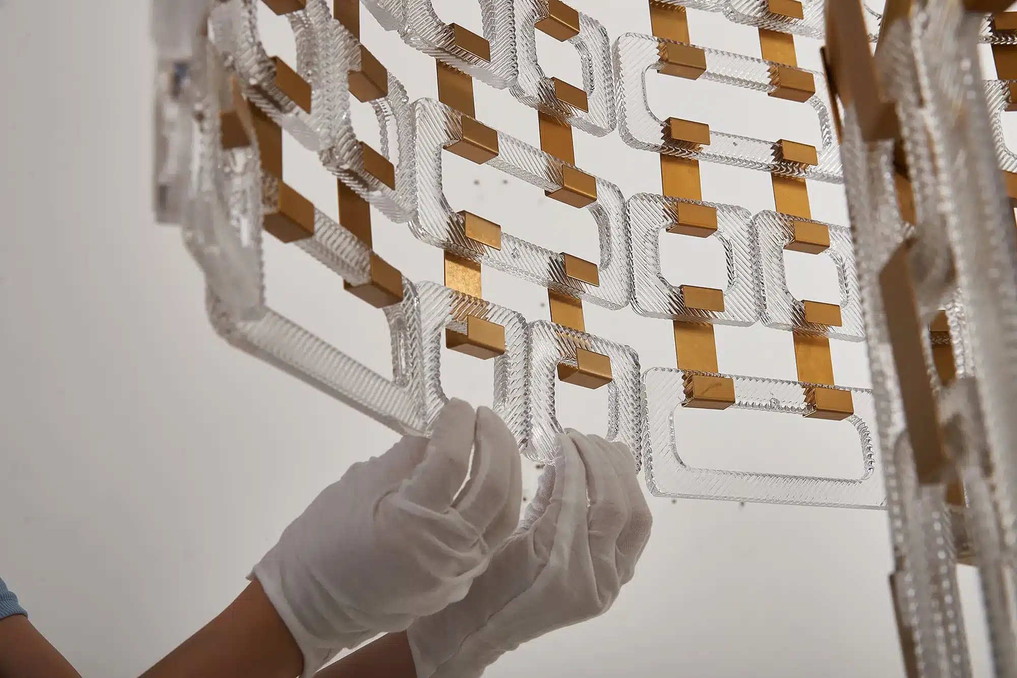 Sculptural design made from square and rectangular clear glass panels