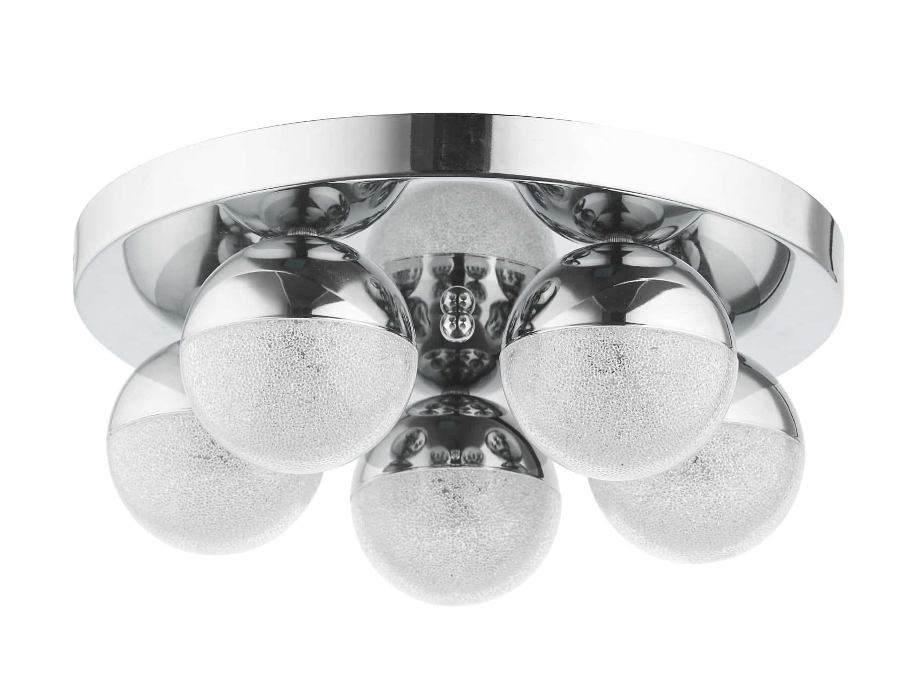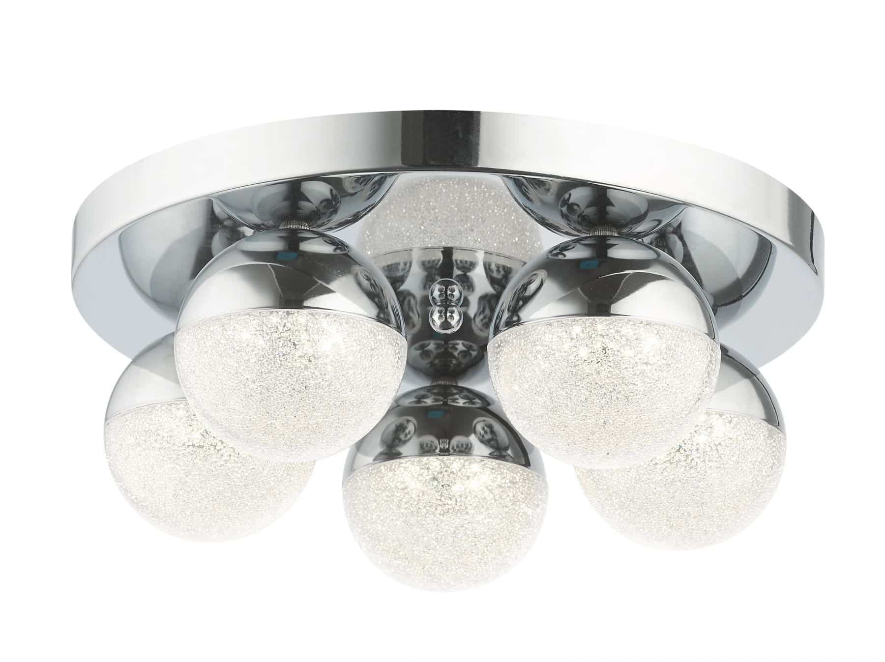 The Dew ceiling light features five decorative half chrome, half acrylic orb shades fixed to a polished chrome cup. Lit by LED from within it adds a beautiful glittery ambience to any bathroom. A matching 1 light wall light is also available.