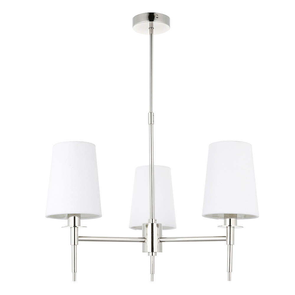 Effie Pendant. An elegant mix of contemporary and classic 3 light design, in bright nickel metalwork with vintage white tapered fabric shades. A sophisticated ceiling light with clean lines and refined style. Matching items are available.