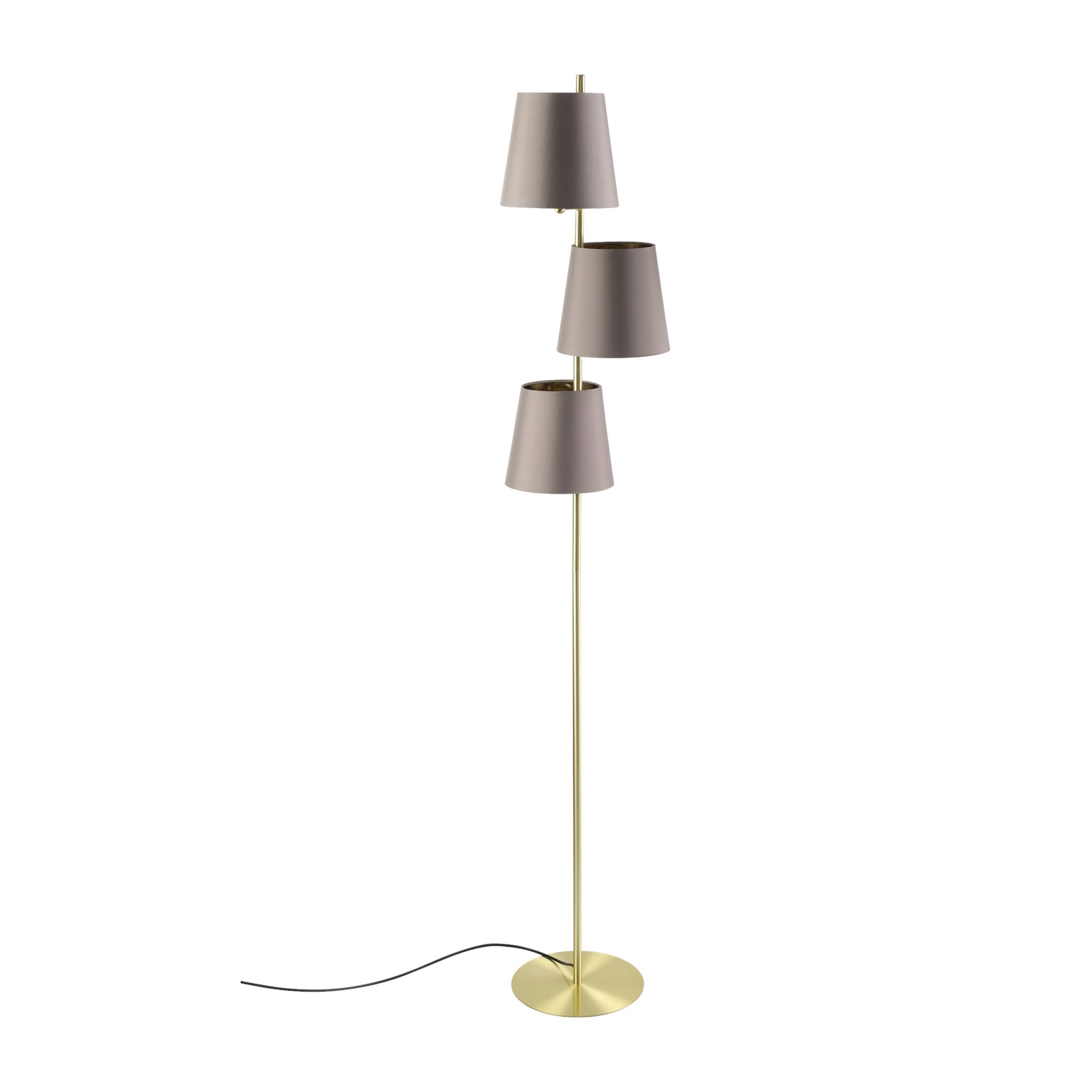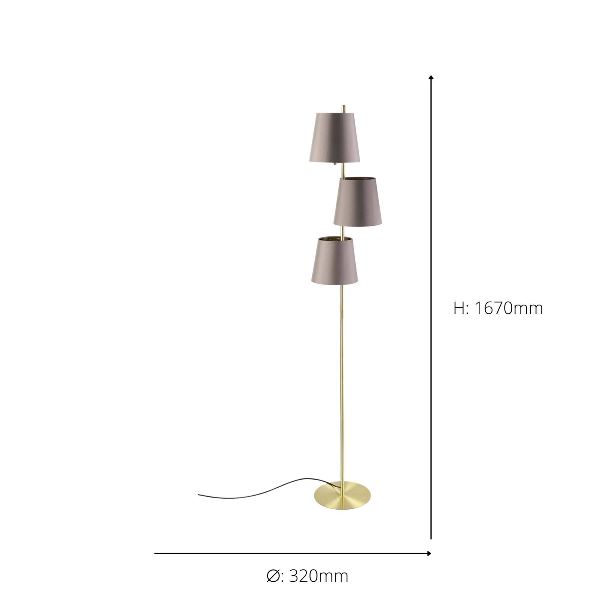The Almeida 2 floor lamp has a metal base in brushed brass, fitted with three conical fabric shades in cappuccino. Featuring a brushed brass inner finish, the shades create an attractive appearance. The lamp can be switched on and off easily using the footswitch. The floor lamp has a 60s-style retro-chic look and blends seamlessly into modern interiors, providing cosy lighting in the bedroom, living room, dining room or hallway. The product requires 3 x E27 lightbulbs which are not included.