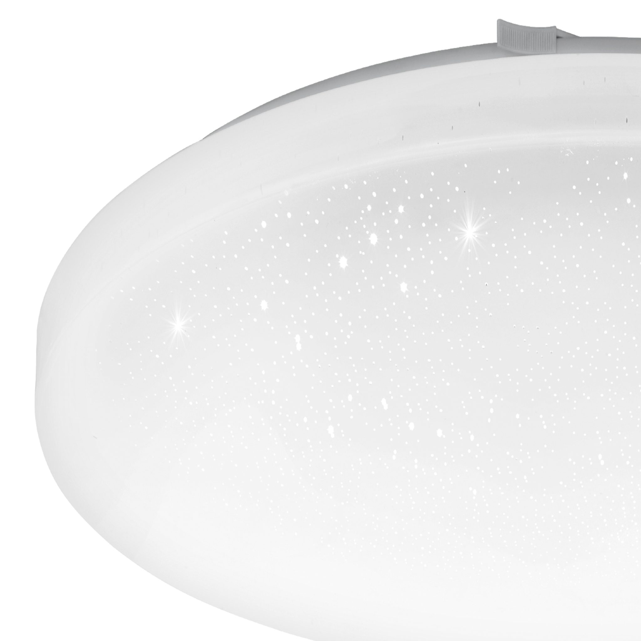 The FRANIA-S is a wall or ceiling light with a white steel finish and a crystal effect on its plastic diffuser. The product has a simple, round design and integrated LED components which produce a warm white light. When illuminated, this pleasant light reflects from the inner crystal effect to produce an interesting and eye-catching lighting ambience. This style of fitting is perfect for homes or offices with lower ceilings due to its compact style and is sure to add a touch of sparkle to any interior.