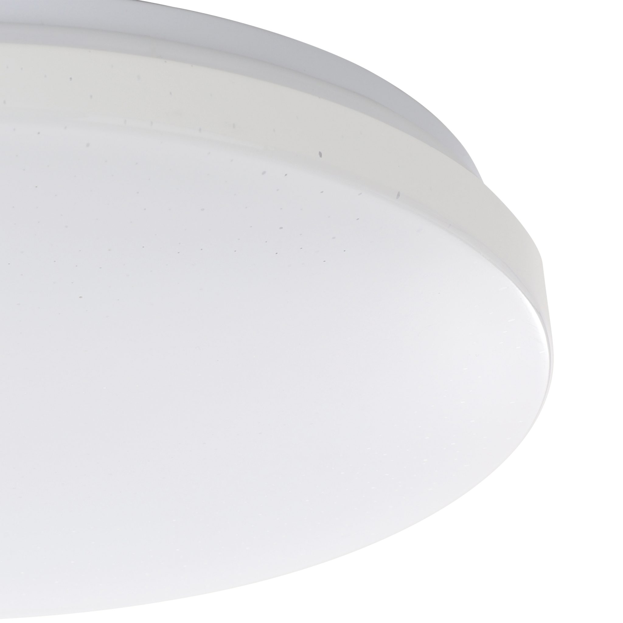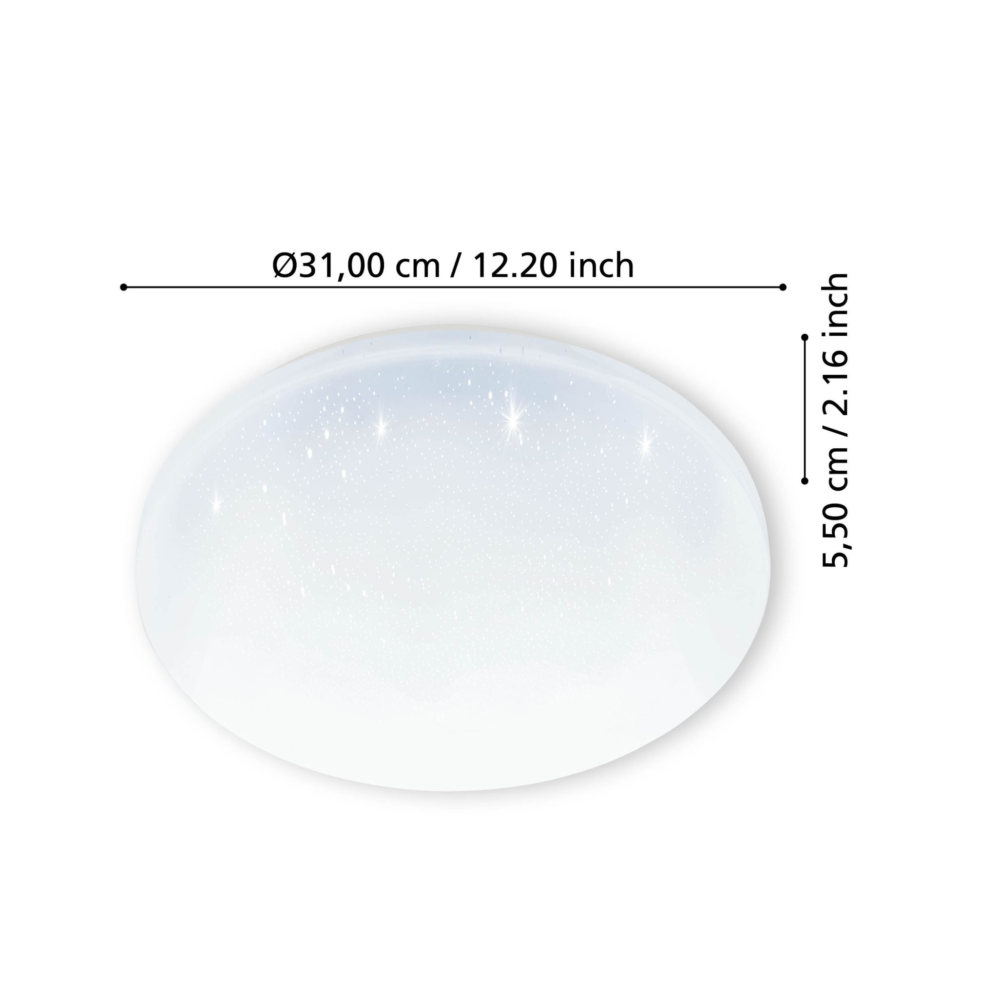 The FRANIA-S LED ceiling light has a round white plastic cover and a white metal rear panel. When the light is on, it shines through the cover creating a sparkling effect like stars in the night sky when it moves. The product is suitable for use in the bathroom due to its IP44 protection against spray water. The integrated LEDs produce a bright neutral white light. With a diameter of 31 cm the ceiling light blends seamlessly into modern interiors. The product provides simple yet distinctive lighting suitable for any space that needs to be well lit, such as the bathroom, kitchen or hallway. Plastic & Steel Body Crystal Effect Finish Versatie Use Minimalist design IP44 rating Integrated LED Produces a neutral white light 5 Year Warranty