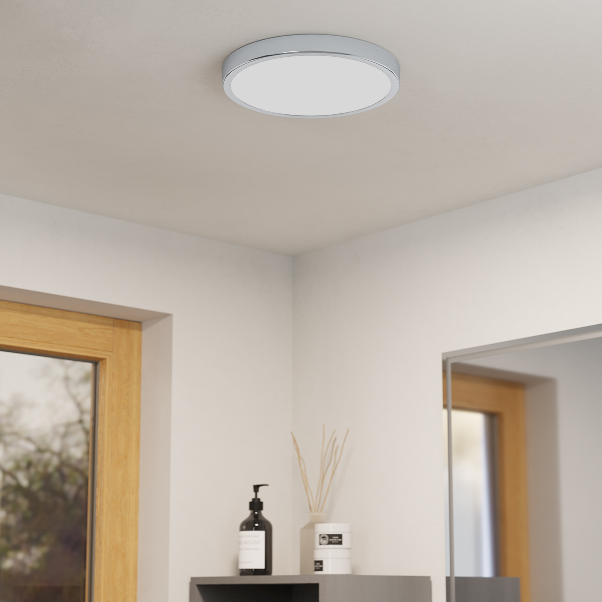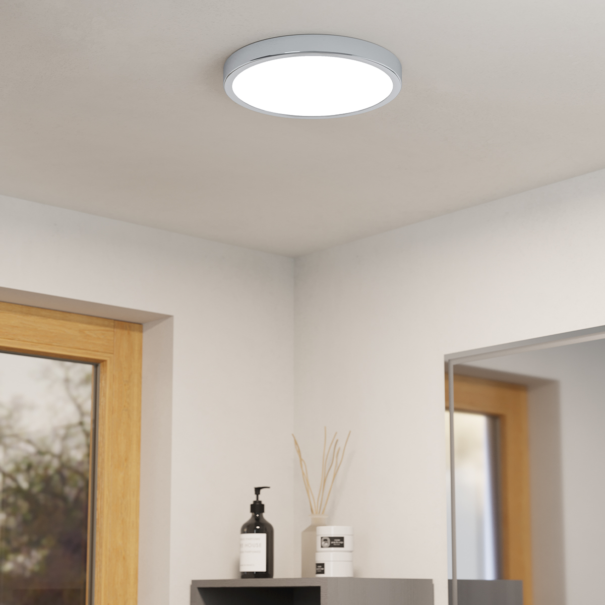 The FUEVA 5 surface-mounted LED light is made of chrome-coloured metal and, with a height of 28 mm, blends with almost any home living trend. With IP44 protection against spray water, it is suitable for use in the bathroom. The integrated LEDs are hidden by the white light diffuser and produce a neutral white light. The ceiling light’s slimline profile means it can also be used easily as a wall light. The high-quality light has no visible screws on its housing, and the special ceiling bracket makes installation extremely straightforward. The surface-mounted light’s classic design and neutral white light are perfect for any space where good lighting is needed, such as the bathroom, kitchen, hallway, utility room or office. Minimalist design Polished chrome finish White plastic diffuser Integrated LED components IP44 rating Suitable for use as bathroom lighting Produces a neutral white light Circular design