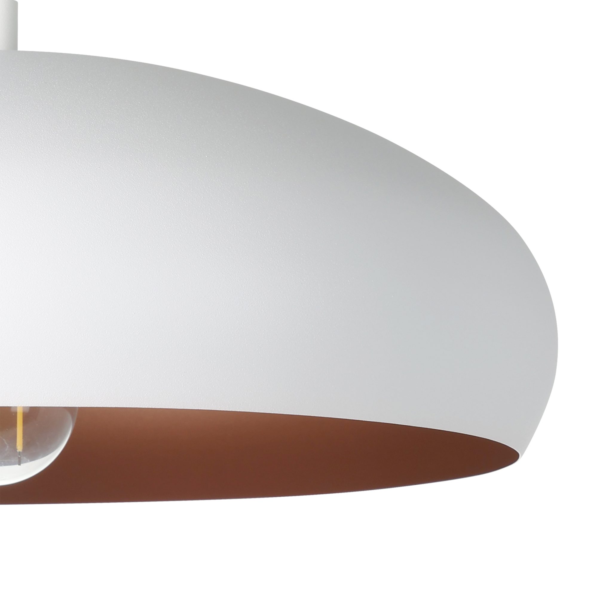 The MOGANO 1 is a single pendant fitting with a rounded shade and metallic flair. The pendant has a white steel finish with a contrasting inner copper shade, which reflects beautifully when illuminated. The MOGANO 1 requires a 1 x E27 lightbulb, which is not included. This style of pendant would complement a range of interiors from retro-inspired to contemporary due to its sleek and eye-catching design. Rounded design Retro feel Contrasting white and copper finish Statement lighting Requires 1 x E27 lightbulb Semi-visible lightbulb style Adds a metallic accent to any space Stylish & versatile