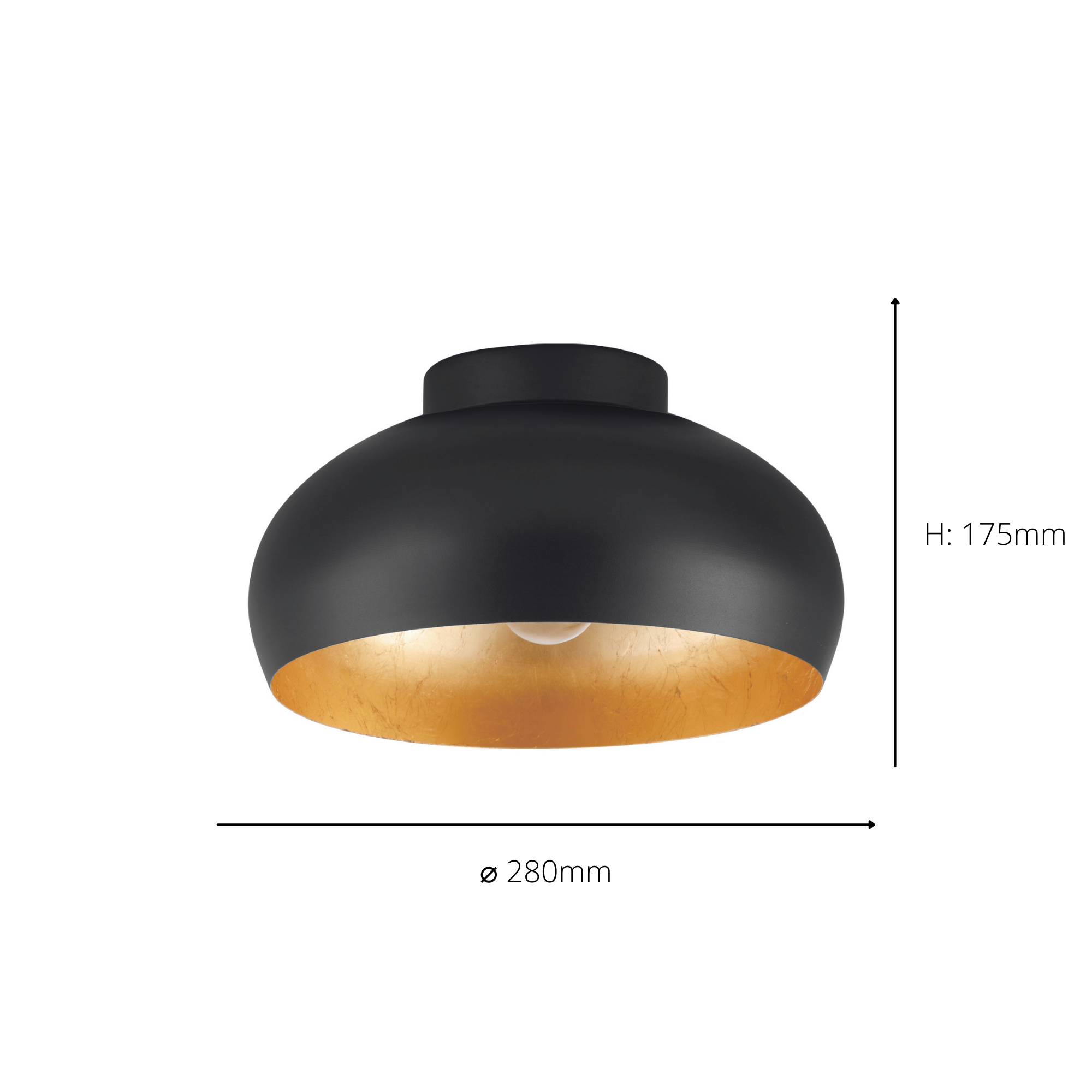 The Mogano 2 ceiling light has a round lampshade made from black metal with a gold-coloured inner finish. The ceiling light blends seamlessly into modern interiors and offers a minimalist lighting solution for any space, whether in the kitchen, living room, bedroom or hallway. The product has an E27 lamp holder and requires 1 x E27 lightbulb, which is not included. Domed shade Inner gold finish Semi-flush ceiling light design Requires 1 E27 lightbulb Compliments any room or interior Stylish and versatile Metallic accents Pair with a vintage-style lightbulb