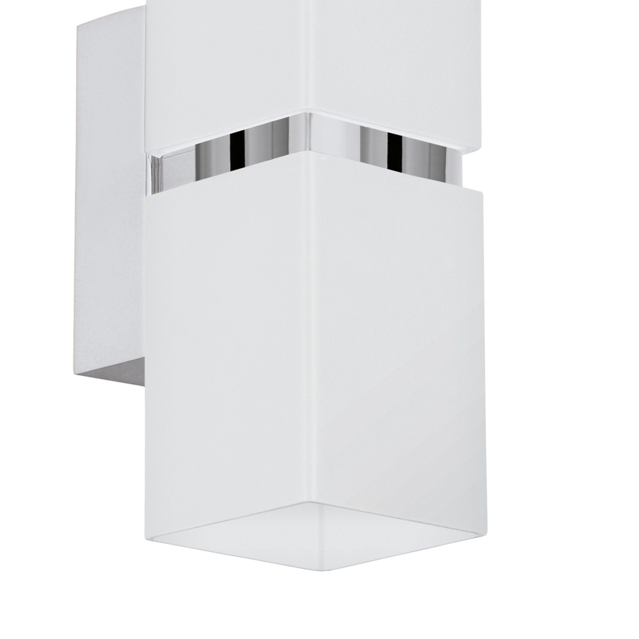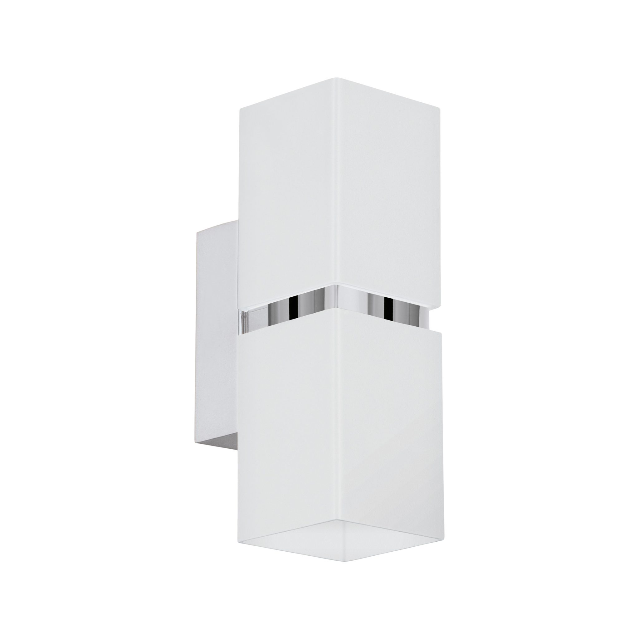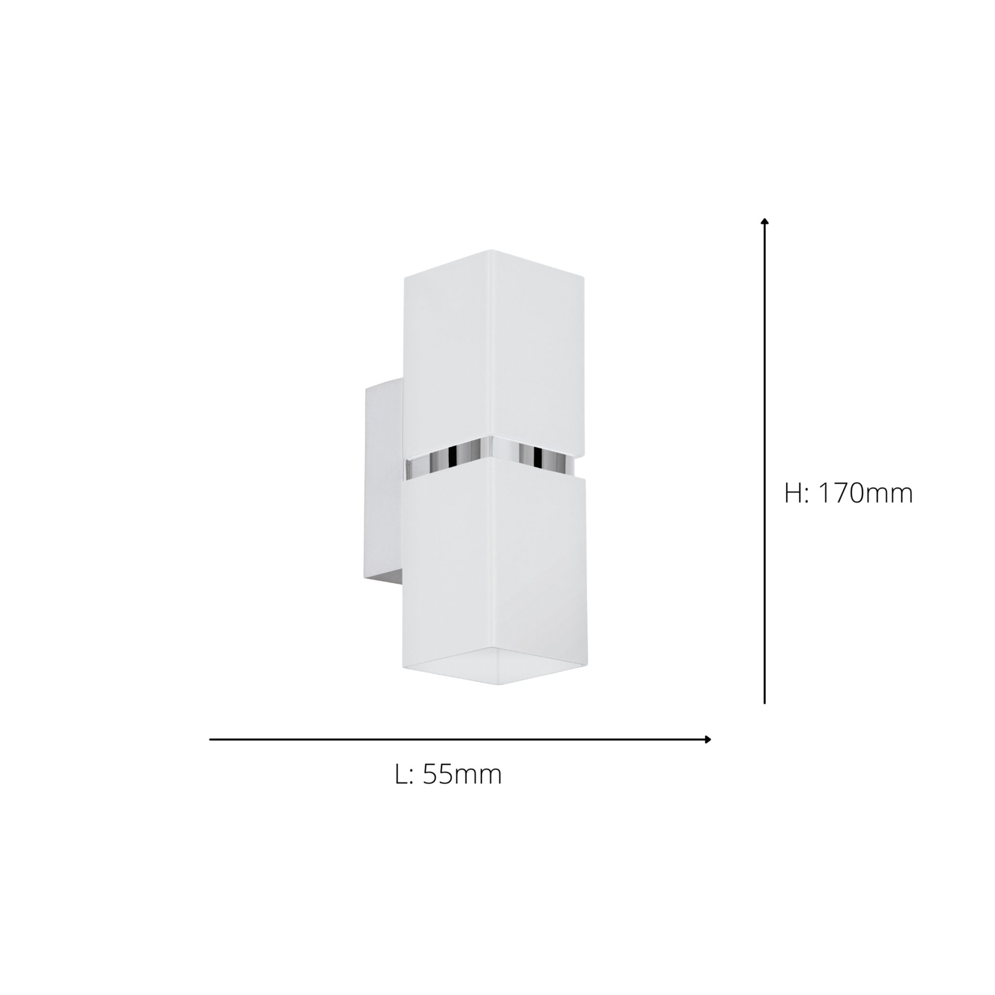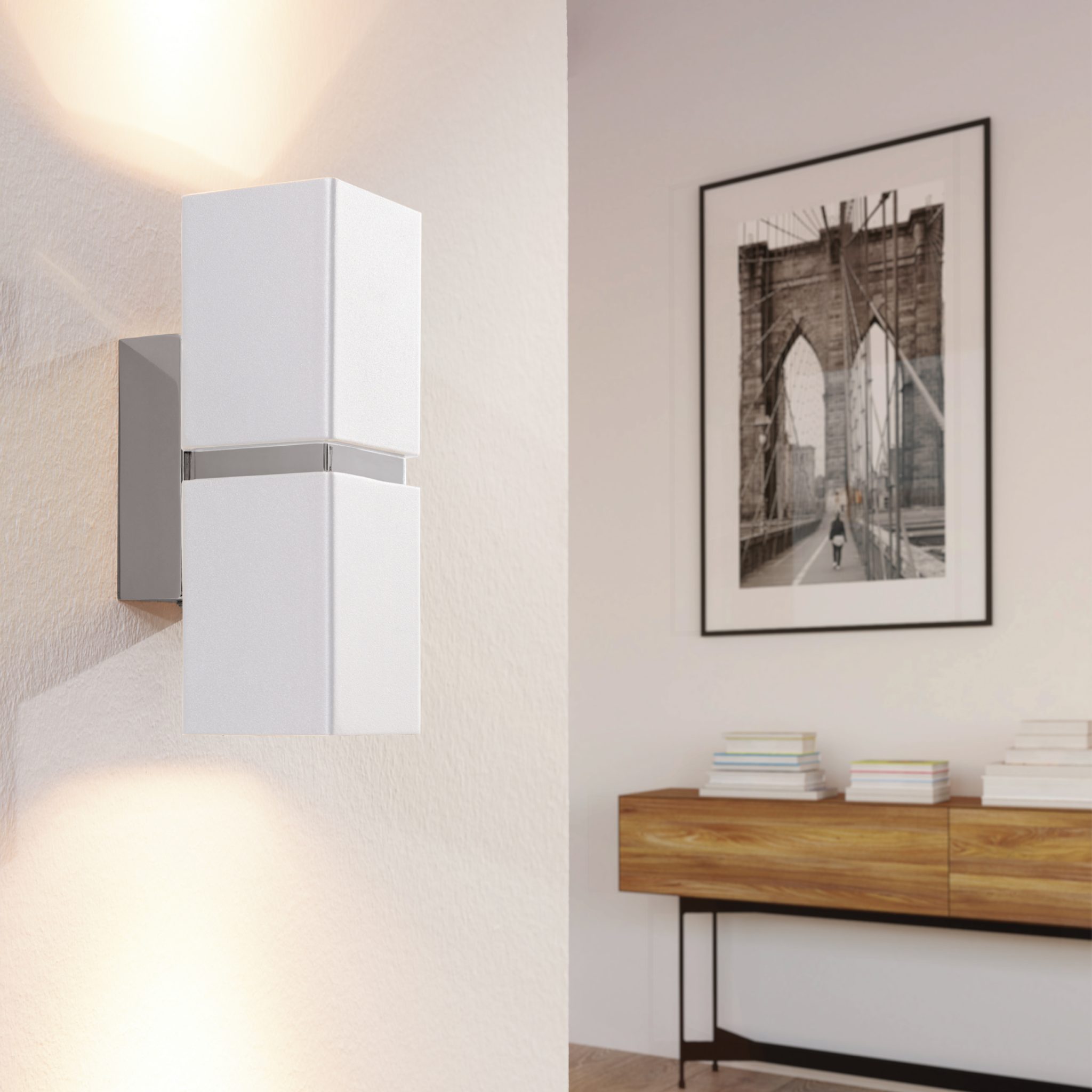 The PASSA LED wall light has a cube-shaped body in white with a chrome-coloured metal wall mount. The product includes GU10 LED lightbulbs that produce a pleasant warm white light and create indirect lighting on the wall due to the up and down design. Due to the modern and minimalist design, the wall light can be integrated into various living spaces, whether in the living room, bedroom, dining room or hallway.