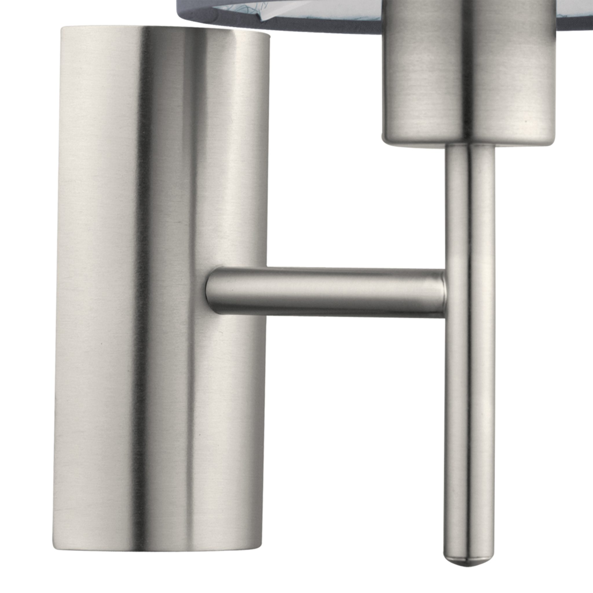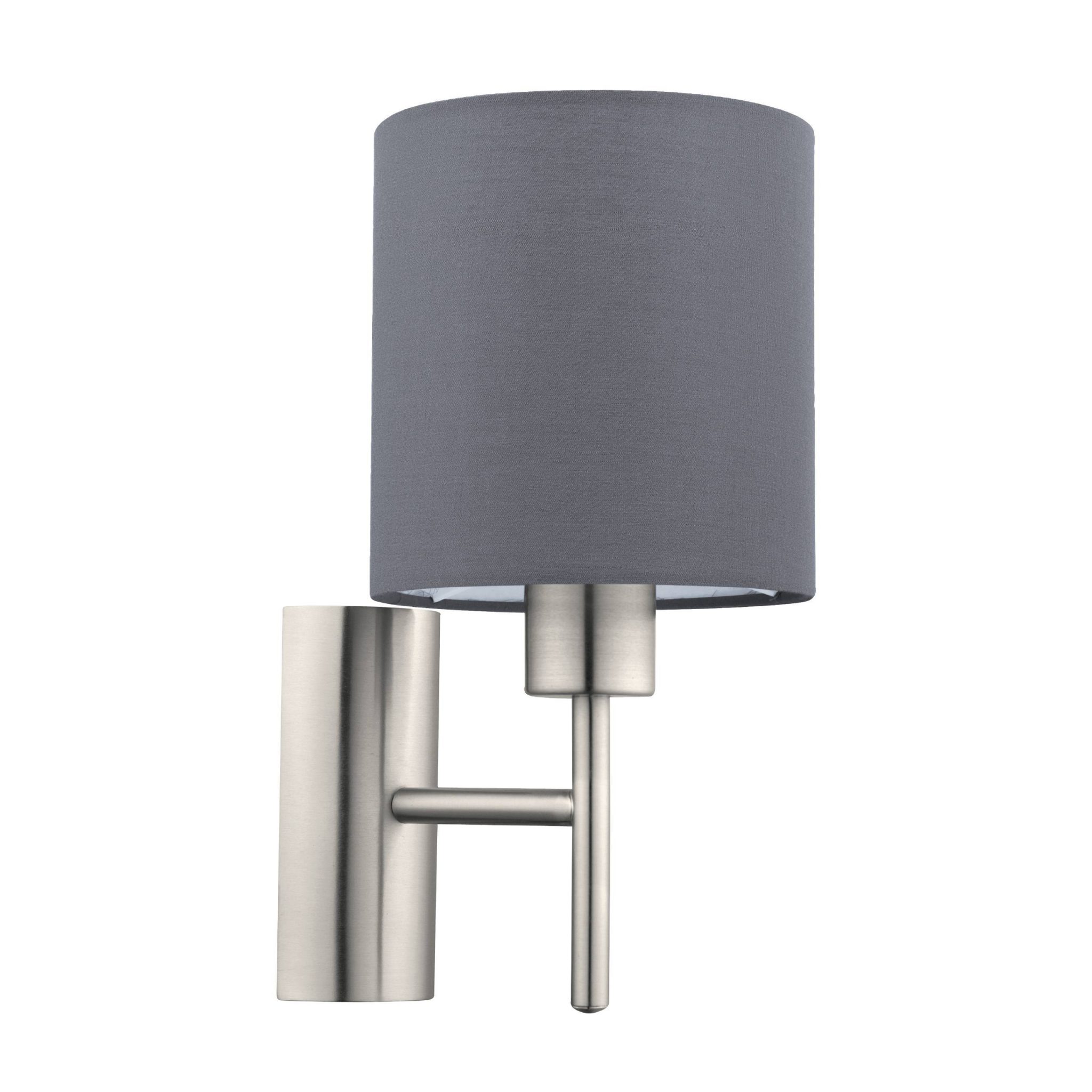 The PASTERI wall light features a matte nickel metal body with a round fabric lampshade finished in grey. The product has a simple design that blends with any interior. The wall light can switch on and off easily using the rocker switch on the body. Whether in the bedroom, living room or hallway, the lamp provides cosy lighting for your living space. The product has an E27 lamp holder and requires 1 x E27 lightbulb, which is not included. Modern design Grey finish Textile shade Satin nickel detailing Operated by rocker switch Requires 1 x E27 lightbulb Versatile and simple style Perfect for a modern home