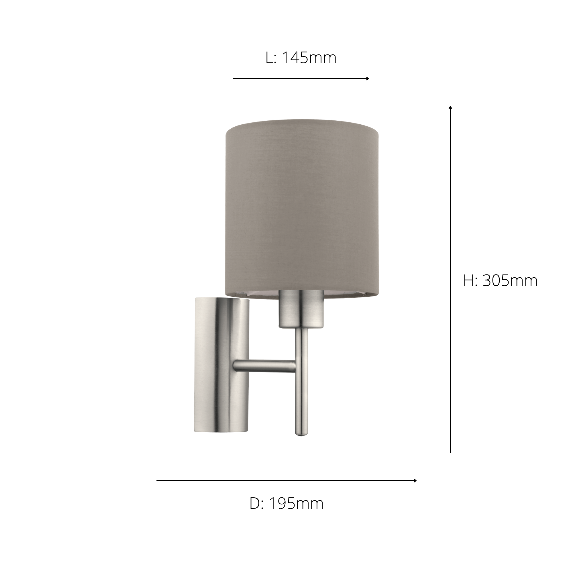 The PASTERI is a contemporary wall light with a satin nickel steel finish and taupe fabric shade. Versatile and sleek, the PASTERI wall light operates by a rocker switch. The product offers a stylish way to illuminate your home and creates a warm and inviting atmosphere with its fabric lamp shade. The wall light requires 1 x E27 lightbulb, which is not included. Modern design Taupe finish Textile shade Satin nickel detailing Requires 1 x E27 lightbulb Stylish & versatile Operated by rocker switch Perfect for a modern home