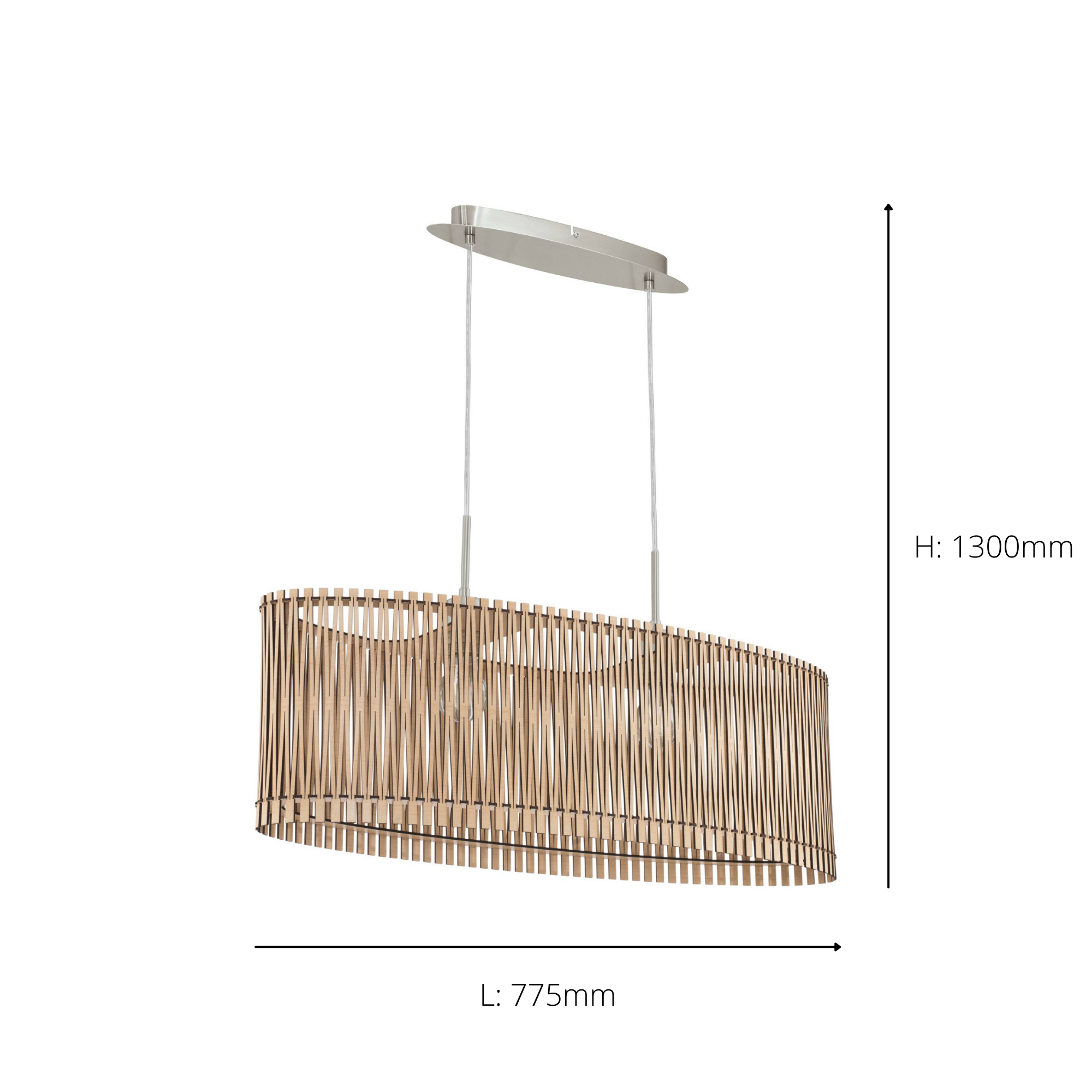 The SENDERO pendant light has an oval lampshade made from maple wood slats suspended from a matte nickel metal canopy. The wooden slats create a fascinating play of light and shadow when the light is on. The pendant light blends seamlessly with modern interior design styles and provides cosy lighting in the living room or above the table in the dining room. Lightbulbs are not included. The product has E27 lamp holders and requires 2 x E27 lightbulbs. IP20 Rating Requires 2 x E27 lightbulbs Maple wood lampshade Perfect for the living room or above the dining room table Mix of metal and natural materials Semi-visible lightbulb design Satin-nickel canopy Complements modern interiors