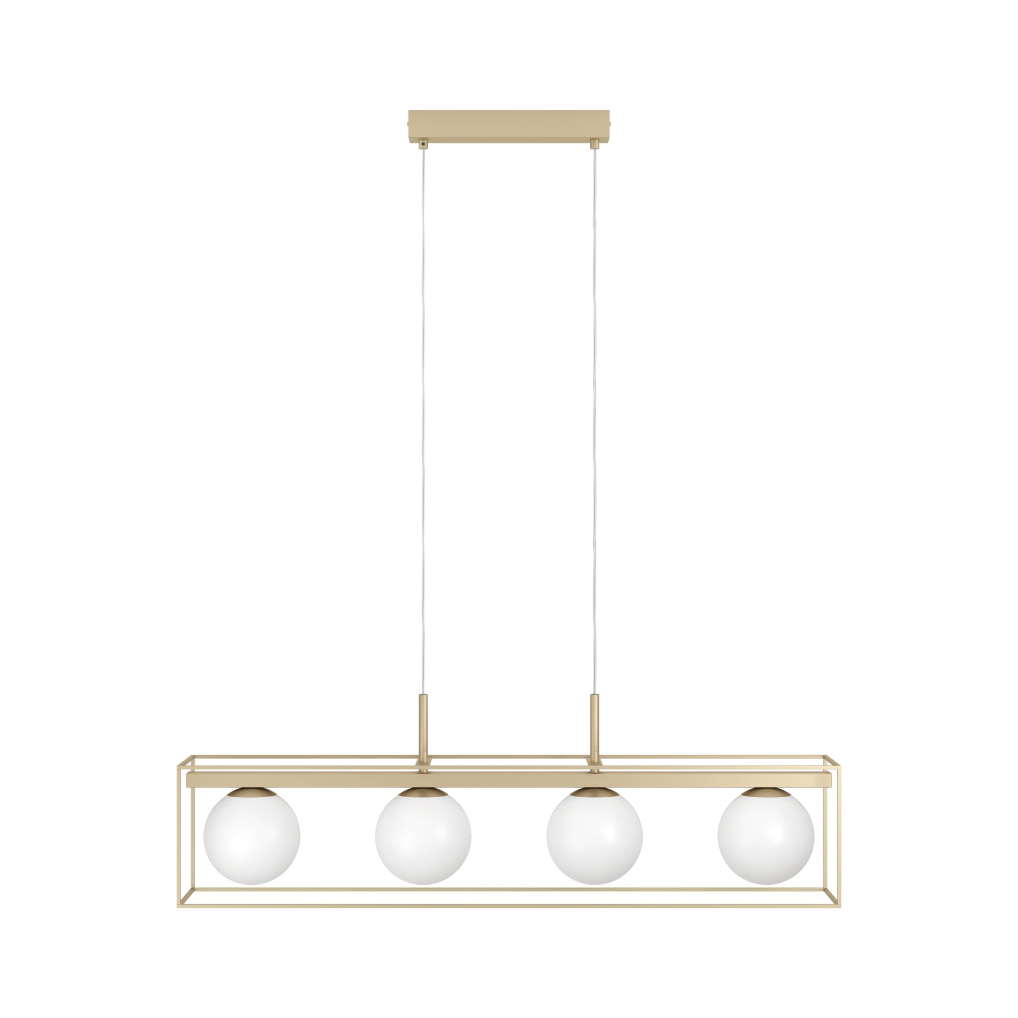 The Vallaspra pendant light has a suspended cube-shaped metal frame in a champagne-coloured finish. The design features four matte white opal glass spheres. The pendant light blends elegantly with minimalist interiors, creating a modern lighting feature in the living room or dining room above the dining table. Lightbulbs are not included. The product has E14 lamp holders and requires E14 lightbulbs. Elegant Frame Stylish Spheres Modern Design Durable Construction Ambient Lighting Requires 4 x E14 Lightbulbs IP20 Protection 2 Year Warranty