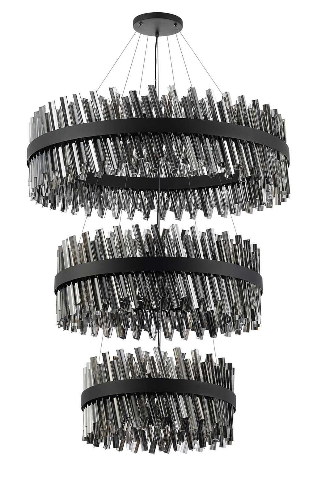A beautiful fitting, the Estelle modern chandelier, 3 tier with 18 + 24 + 32 Light G9 bulbs. Made with a satin black/smoke combination, this chandelier has a weight of 70kg.