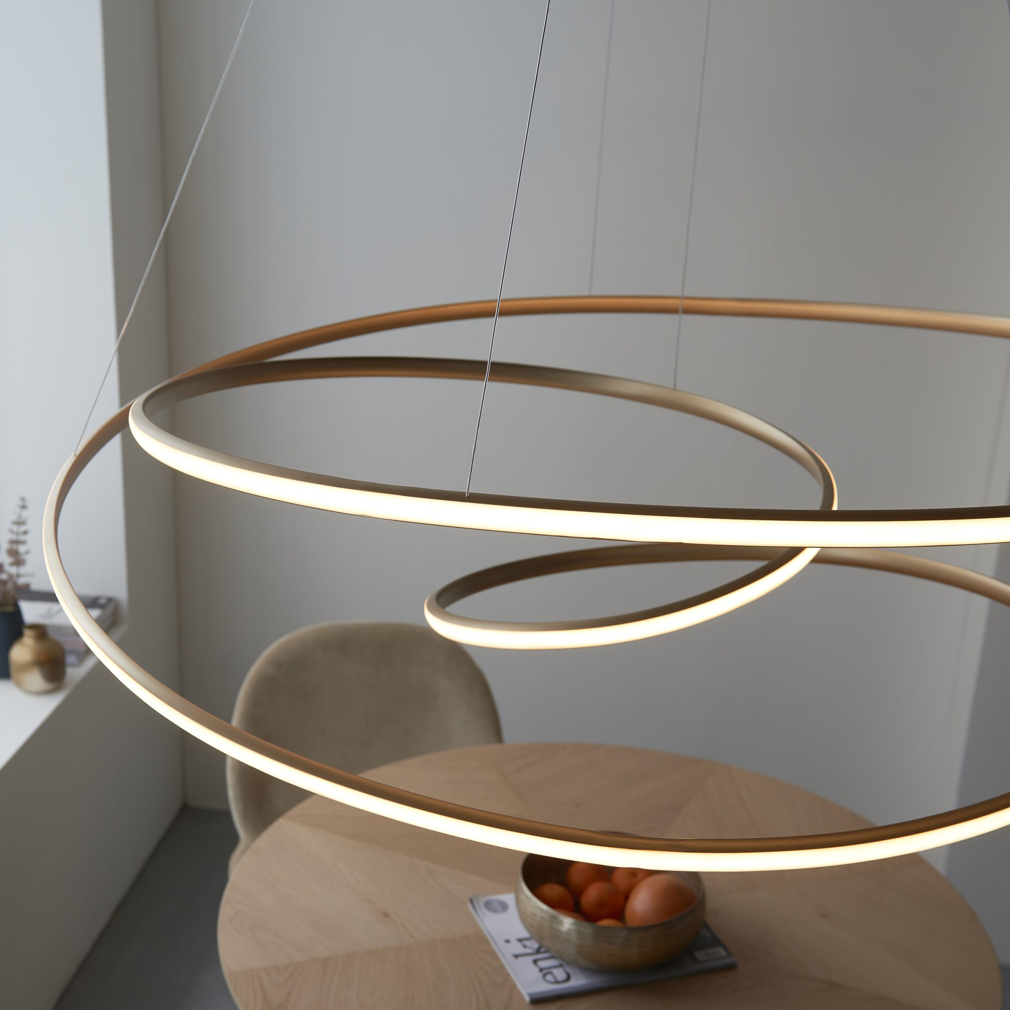 Bring contemporary style to any interior with this stunning designer pendant featuring an ethereal ribbon of light. The exquisite, gold-and-white trimmed spiral appears to float effortlessly, creating a gentle wash of LED light which is fully dimmable, depending on your requirements. Available in two sizes.