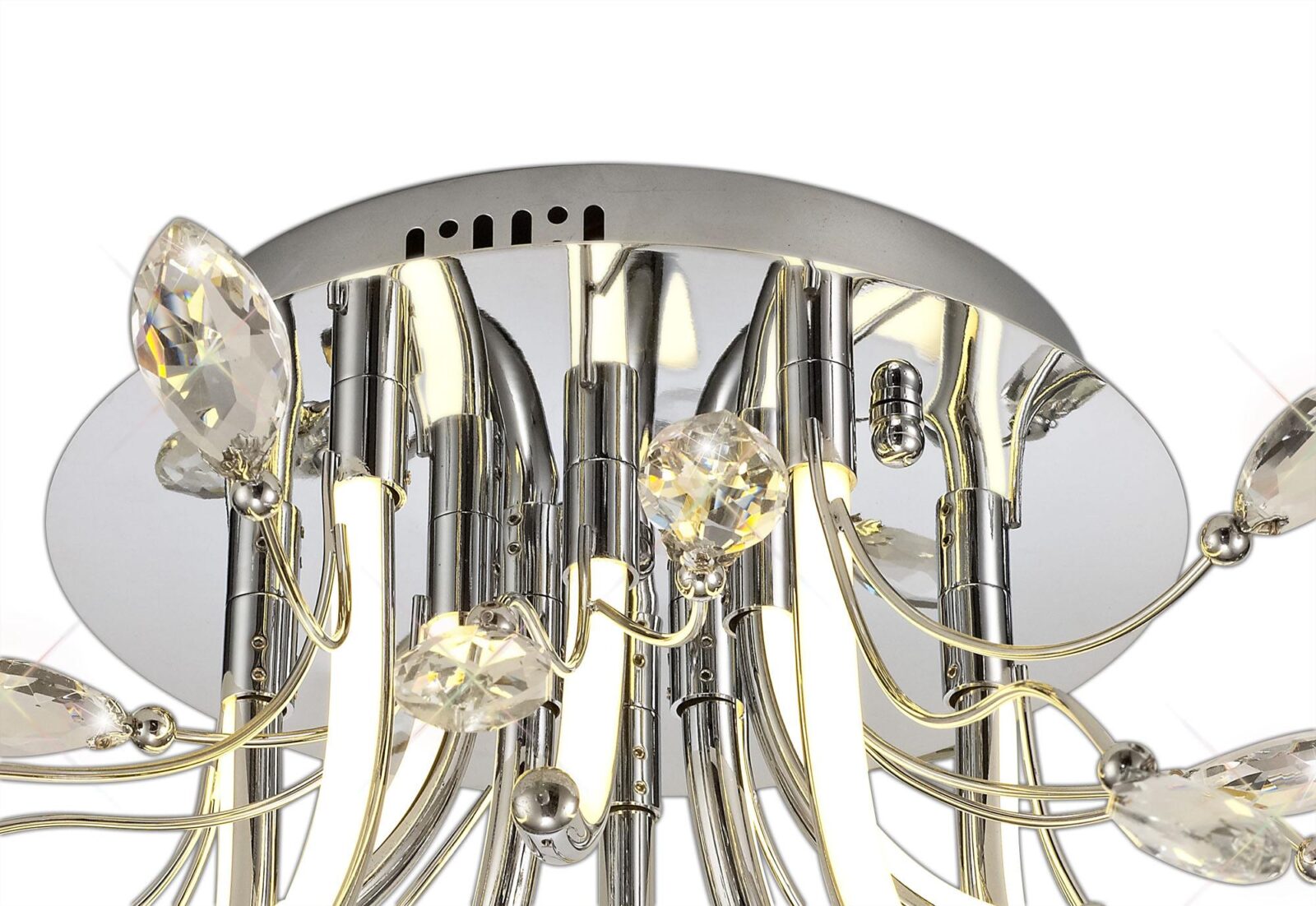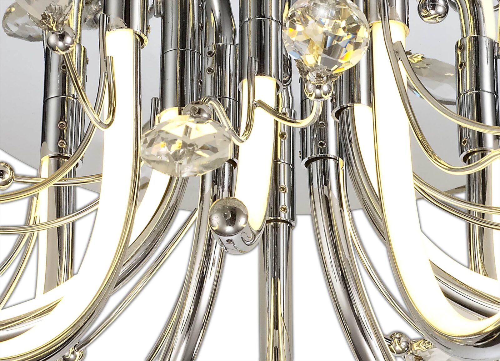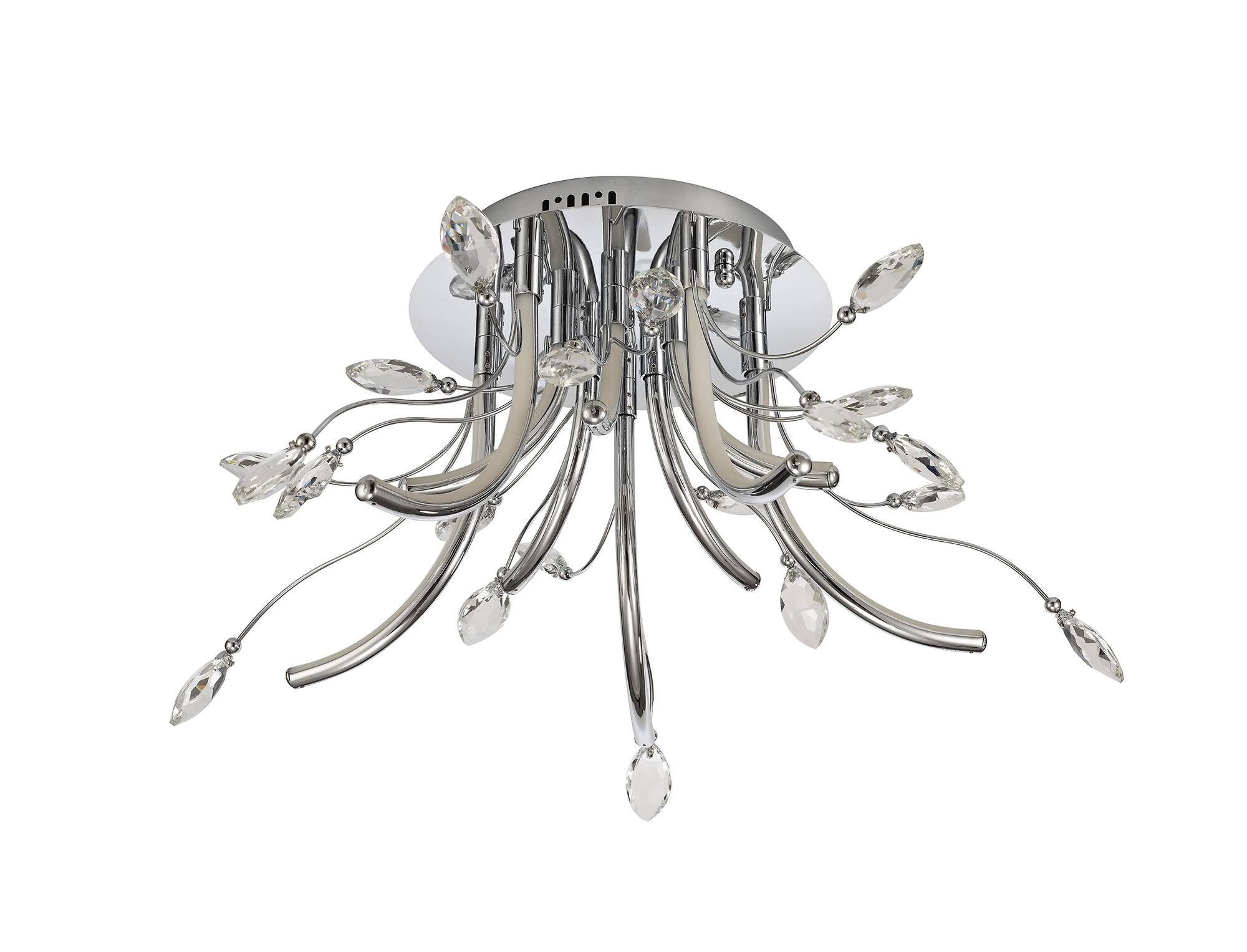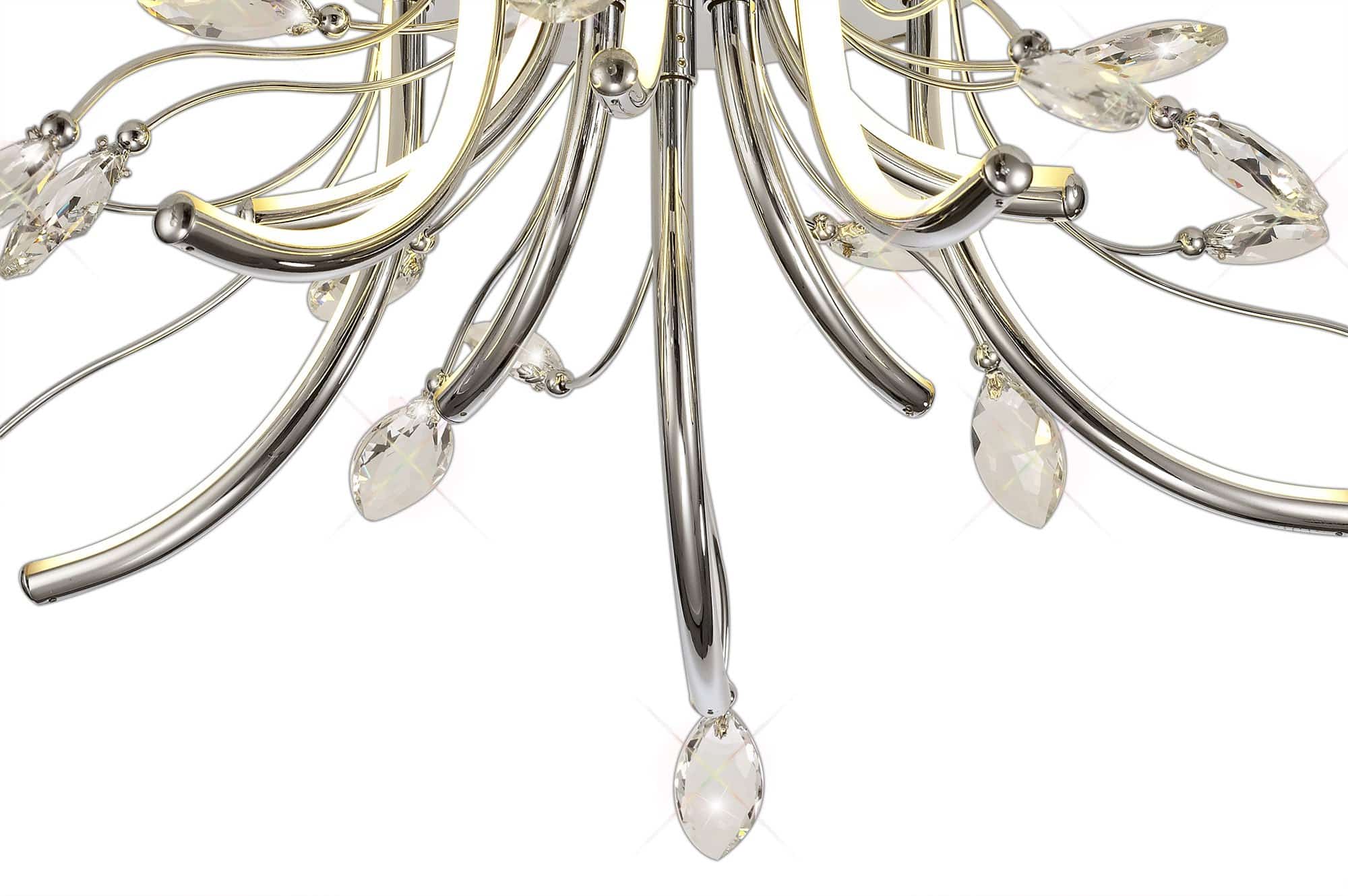 Fidelio breaks away from the common methods of displaying integral LED lighting which have now become the norm for modern designs. The warm light from the LED’s are reflected throughout the fitting as a whole, diffused along the curved chrome arms protruding from the ceiling plate. The curvature of these arms first sending the light in an outwards direction then begins to throw the light at an upward angle. This ensures the leaf shaped clear crystals, fixed to the ends of the polished chrome waved stems, are enhanced by the LED light to produce a dazzling effect. With various lighting options available, Fidelio’s sophisticated elegance is striking even when unlit.