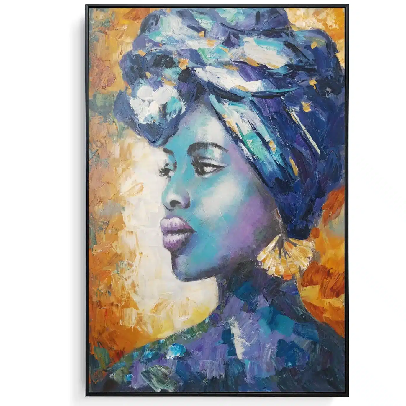 This oil painting portrayed a woman adorned in gold and blue. The artist’s use of colour and brushstrokes creates a striking image that captures the woman’s beauty and strength. This African style artwork is a stunning example of art that celebrates diversity and showcases the talent of the painter.