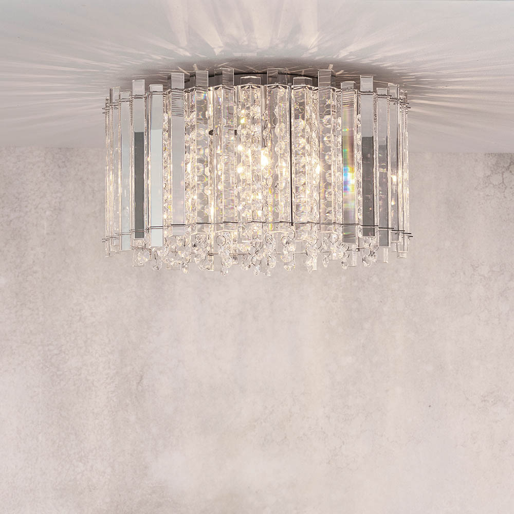 A beautiful high quality, reflective clear crystal ceiling light, Hanna 4lt Flush.  Filled with faceted glass droplets for an opulent addition to the most loved interiors of your home. Complete the look with the matching ceiling pendant and wall light.