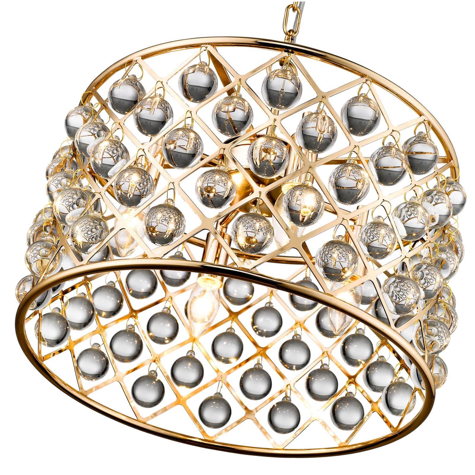 Henrietta Four Light Pendant Luminaire In Gold. An eye catching drum shaped pendant with crystal droplets that hang from a chrome or gold criss cross metal frame.  Completed with a matching canopy. Henrietta collection is available in various sized pendants and in a Gold or Chrome finish