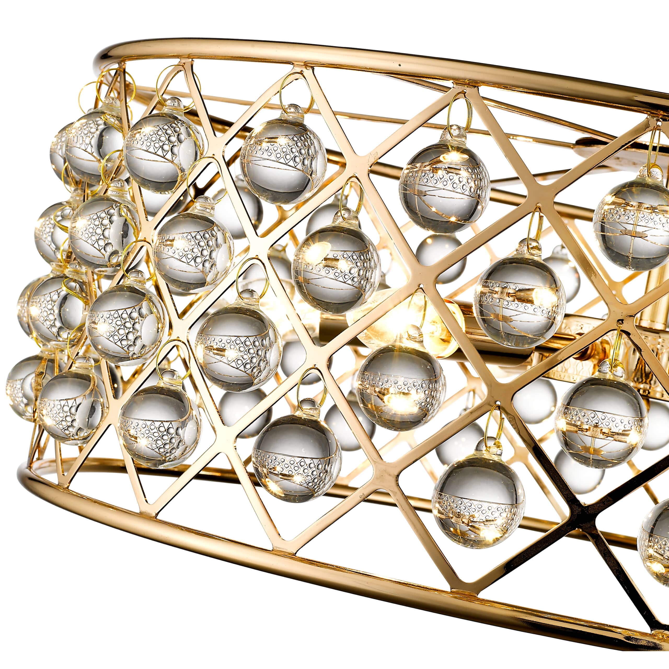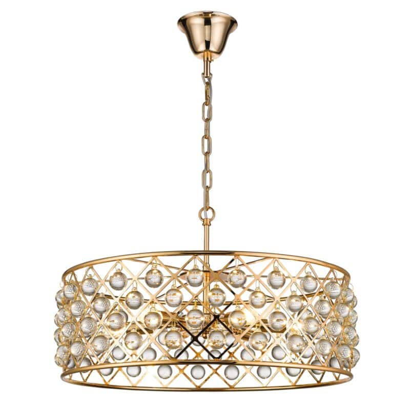 Henrietta Six Light Pendant Luminaire In Gold.  An eye catching drum shaped pendant with crystal droplets that hang from a chrome or gold criss cross metal frame.  Completed with a matching canopy. Henrietta Collection is available in various sized pendants including a 4, 5 and 6 light and in a Chrome or Gold finish