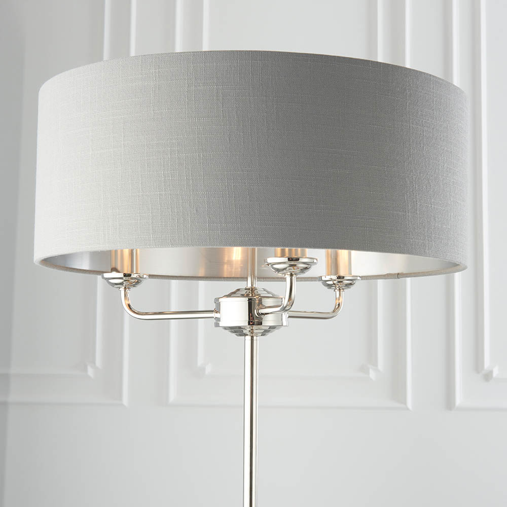 This floor lamp is a sophisticated combination of charcoal linen mix fabric shade with a reflective brushed metallic inner and bright nickel metalwork. This statement floor lamp is the perfect timeless addition to modern and classic homes of today. Classic modern design styling Bright nickel plated finish Charcoal linen mix fabric shade lined with brushed metallic inner In-line on/off foot switch with 2 metres black flex Perfect for use with E14 LED lamps