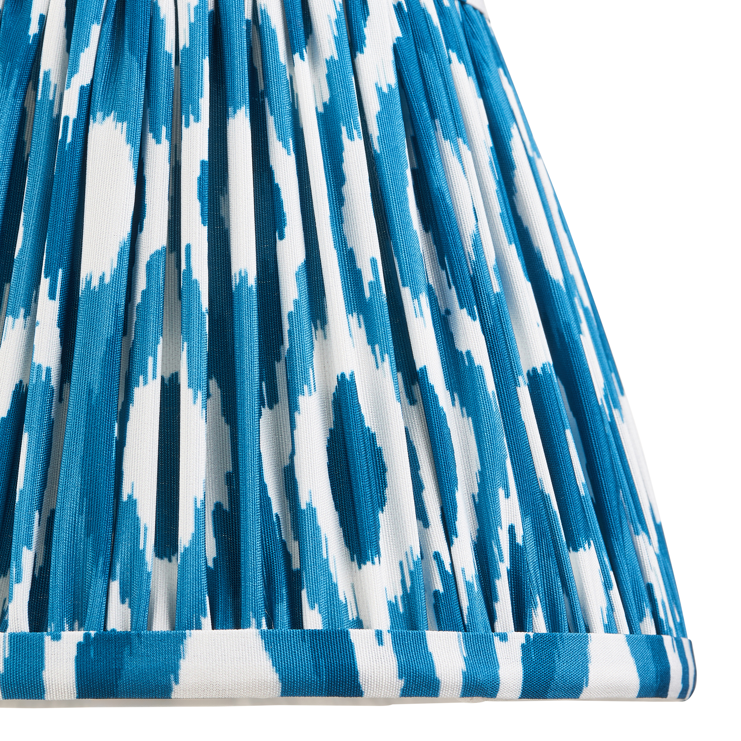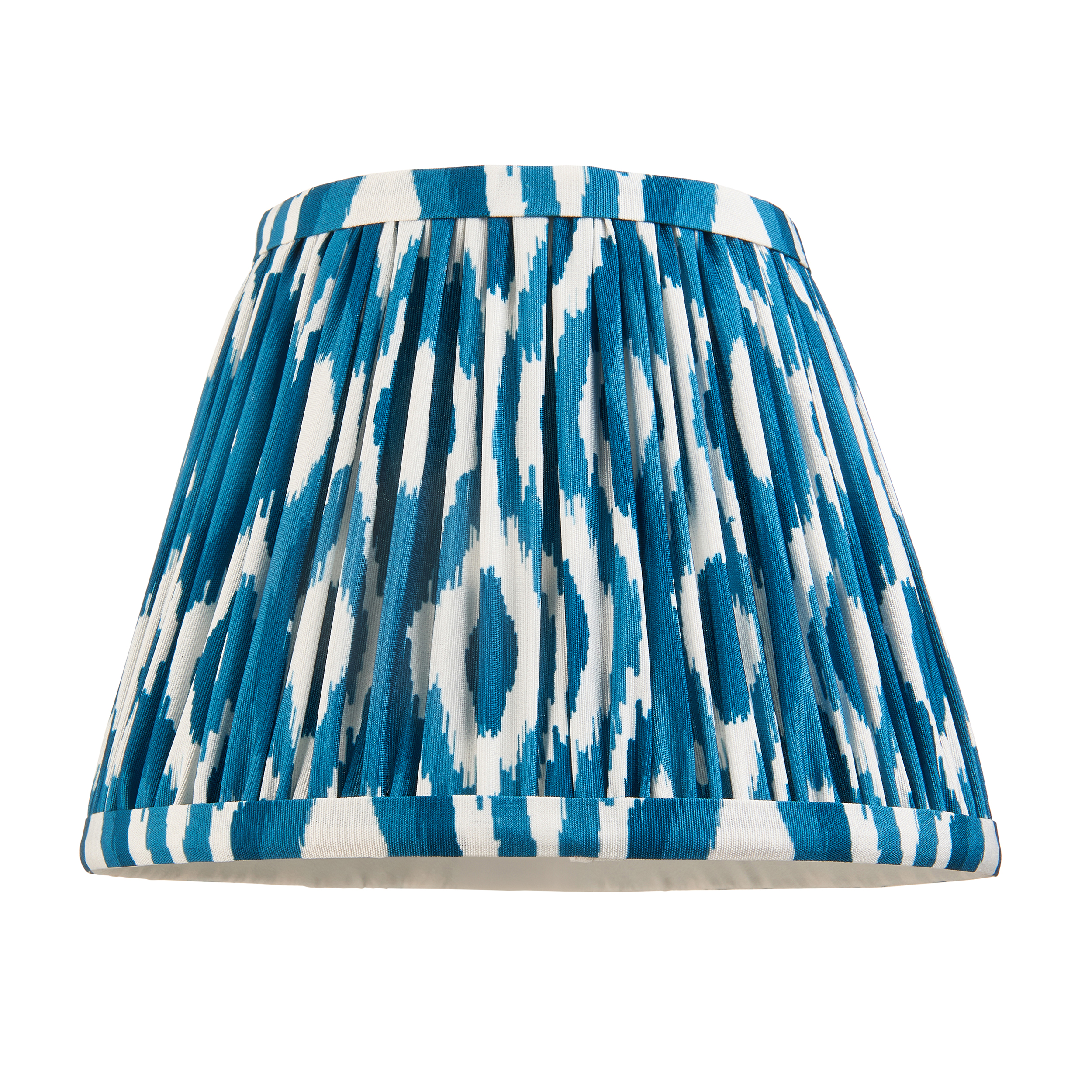 20cm tapered shade with white gimbal. Unique Ikat pattern design in marlin blue with taped edge detailing and plain inner lining. Perfect when paired with one of our beautifully decorative table lights, wall lights or chandeliers. Handcrafted 20cm tapered shade Gathered pleated design Digitally printed marlin blue faux silk fabric Taped edge detailing with plain inner lining Fixed gimbal, suitable for both table & pendants